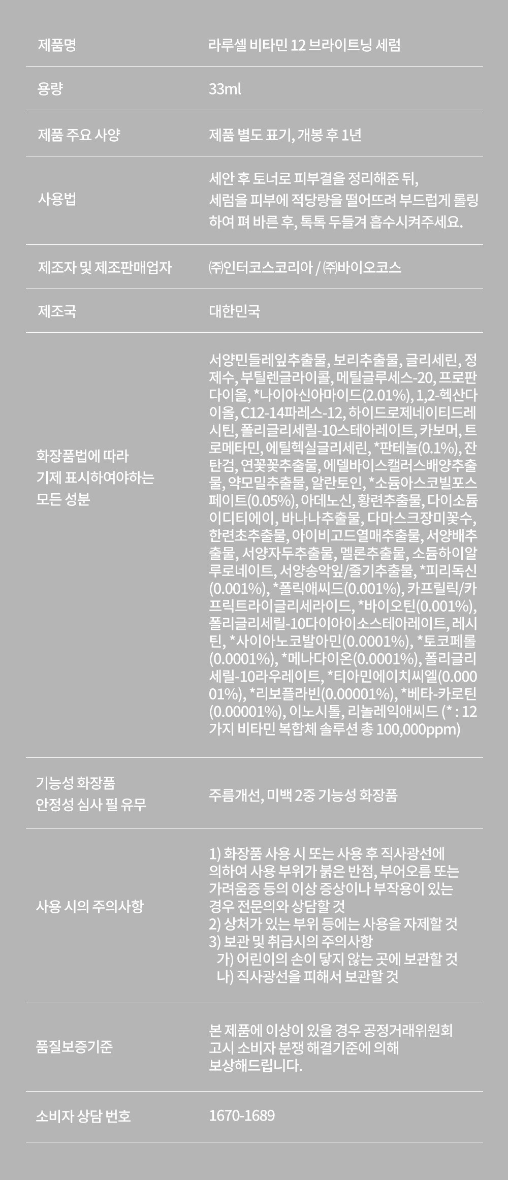 | 용량(중량) | 33ml | 제품 주요 사양 | 모든피부용 |