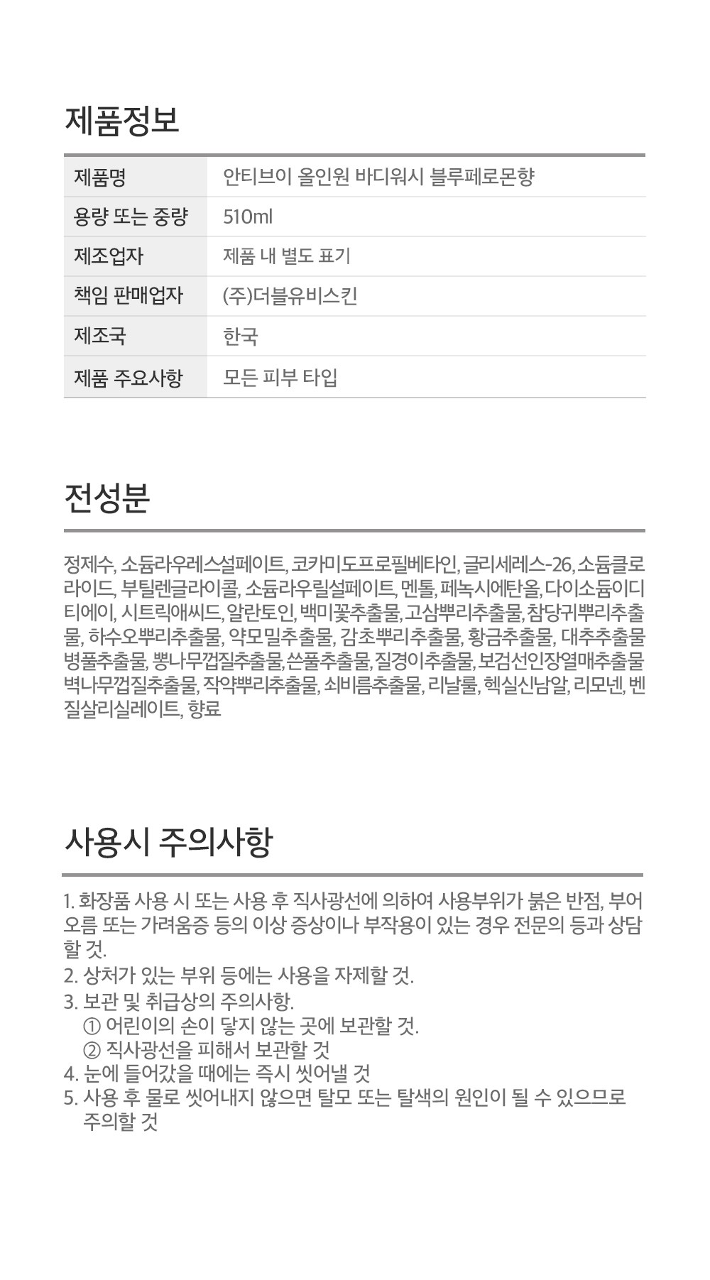 | 용량(중량) | 510ml x 2개 | 제품 주요 사양 | 모든 피부용 |
