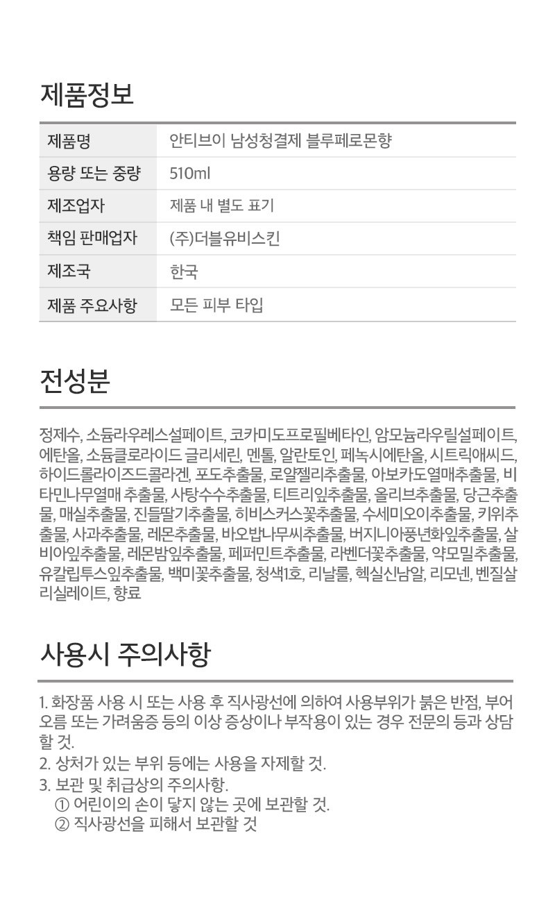 | 용량(중량) | 510ml | 제품 주요 사양 | 모든 피부용 |