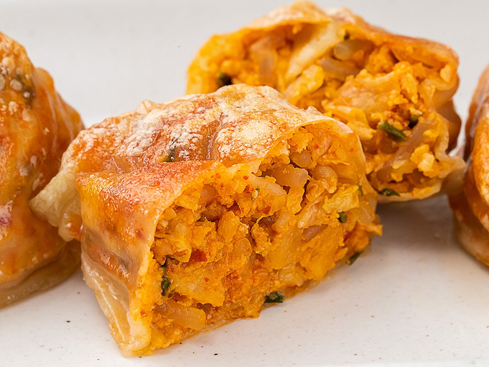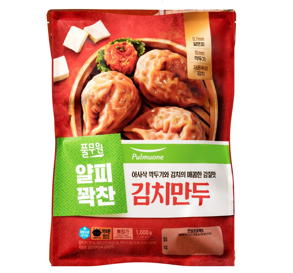 꽉 찬 속재료가 투명하게 비치는 풀무원의 김치만두예요. 손으로 빚은 듯 얇은 만두피 속에 배추김치와 아삭한 깍두기, 큼직하게 썬 돼지고기, 부드러운 두부 등의 다양한 재료를 듬뿍 담았어요. 다채로운 맛과 식감이 어우러지며 깊은 맛을 느껴보실 수 있답니다.