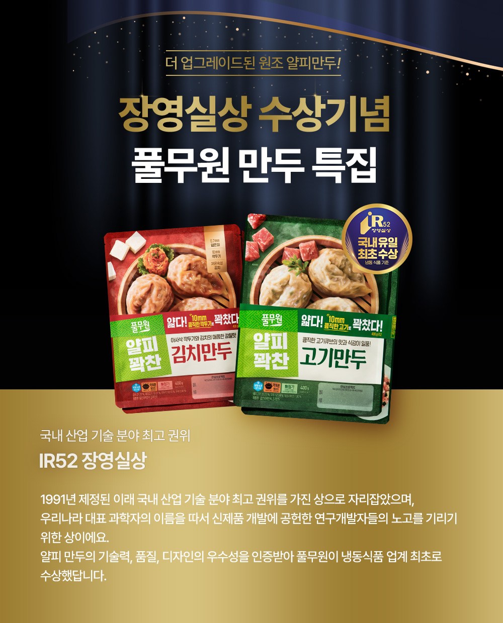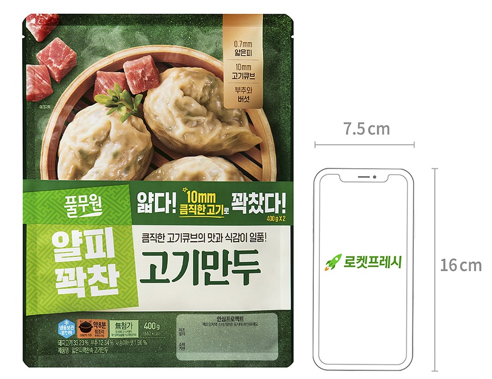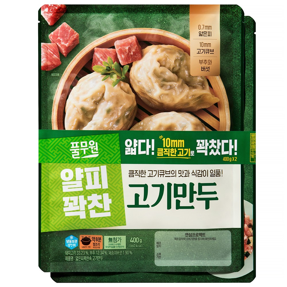 만두전문점에서 보던 얇은 만두피로 빚은 만두를 가정에서 만나보세요. 꽉 찬 만두소가 눈으로 보여 더욱 먹음직스러운 고기만두예요. 보들보들 얇은 만두피를 풍성한 만두소로 채웠어요. 굵게 썬 돼지고기가 고소한 풍미를 책임지죠. 신선한 부추와 탱글한 새송이버섯이 풍미를 더했답니다. 푸짐한 만두소가 자아내는 감칠맛은 언제 먹어도 질리지 않아요. 촉촉하게 쪄 간식으로, 바삭하게 구워 안주로, 만둣국을 만들어 식사로 즐겨보세요.