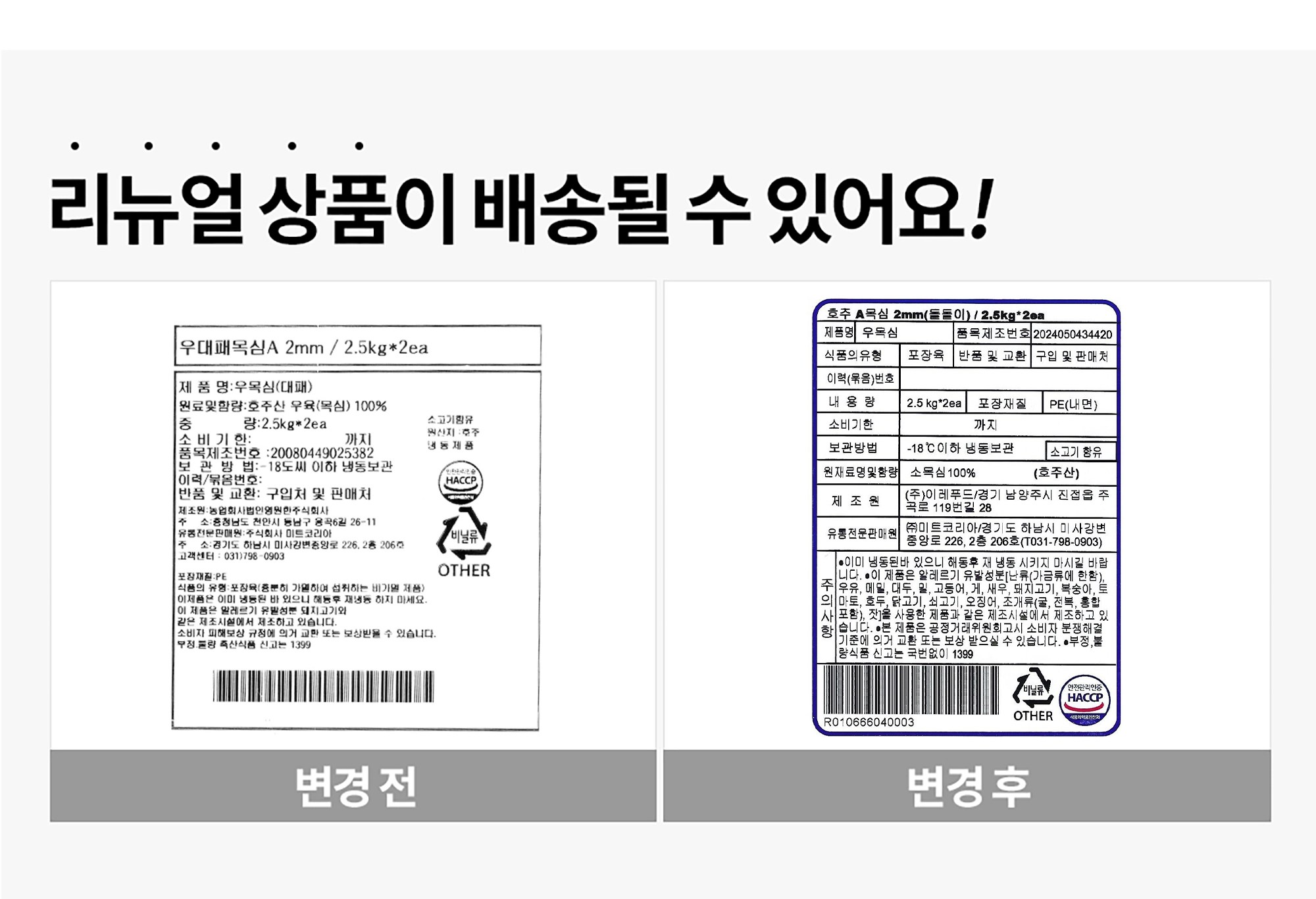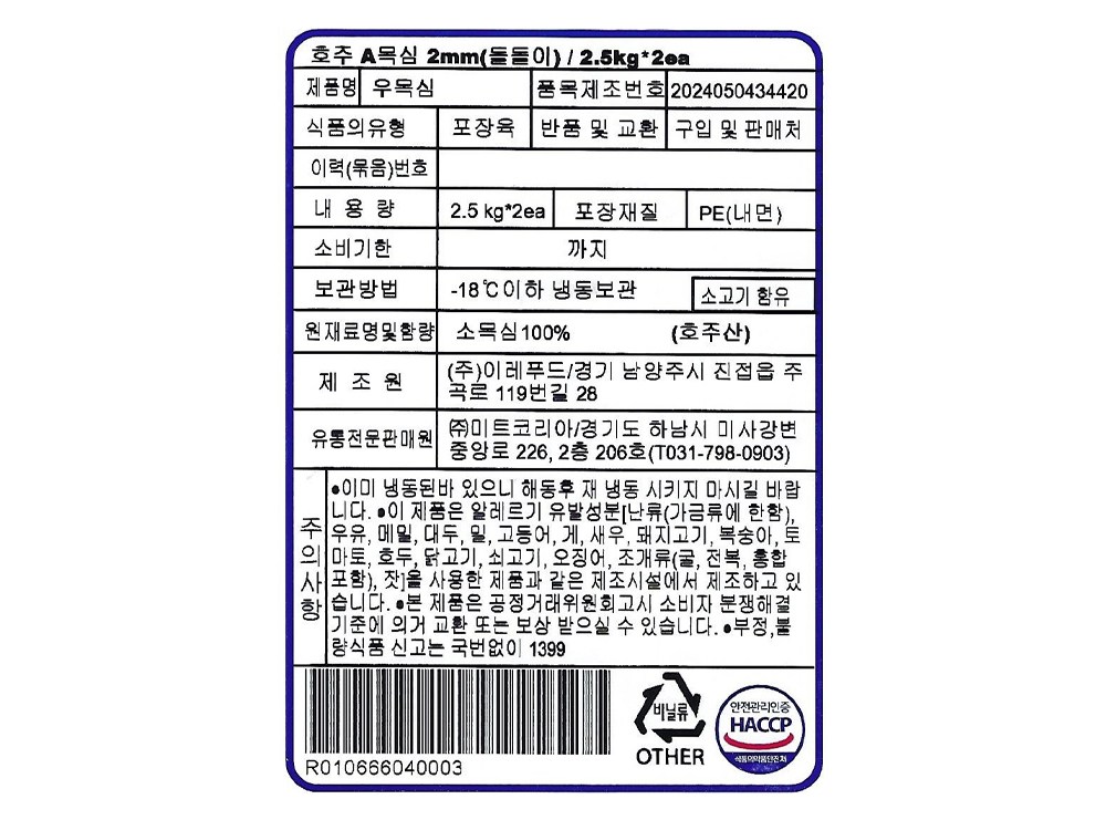 | 제조연월일, 소비기한 또는 품질유지기한 | 소비기한(또는 유통기한) : 2027년 04월 12일 이거나 그 이후인 상품 제조년월일 : 2026년 04월 13일 이후인 제조상품 | 세부 품목군별 표시사항 | 축산물 등급표시 : 해당 없음 / 이력번호 표시유무 : 이력번호 표시제품임 |