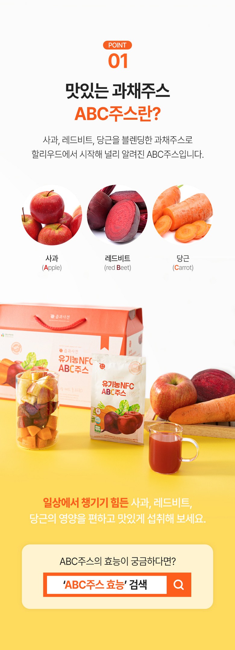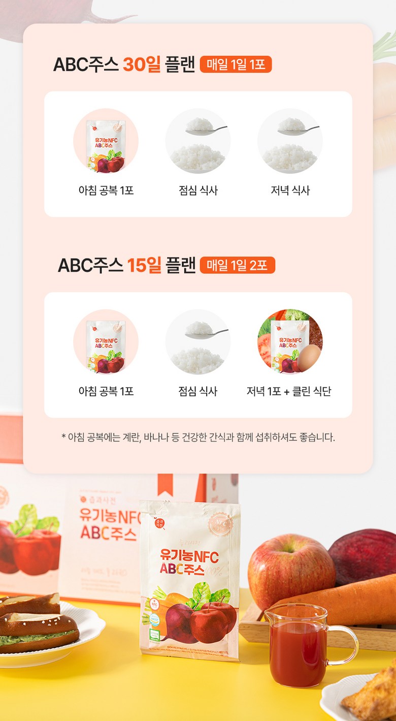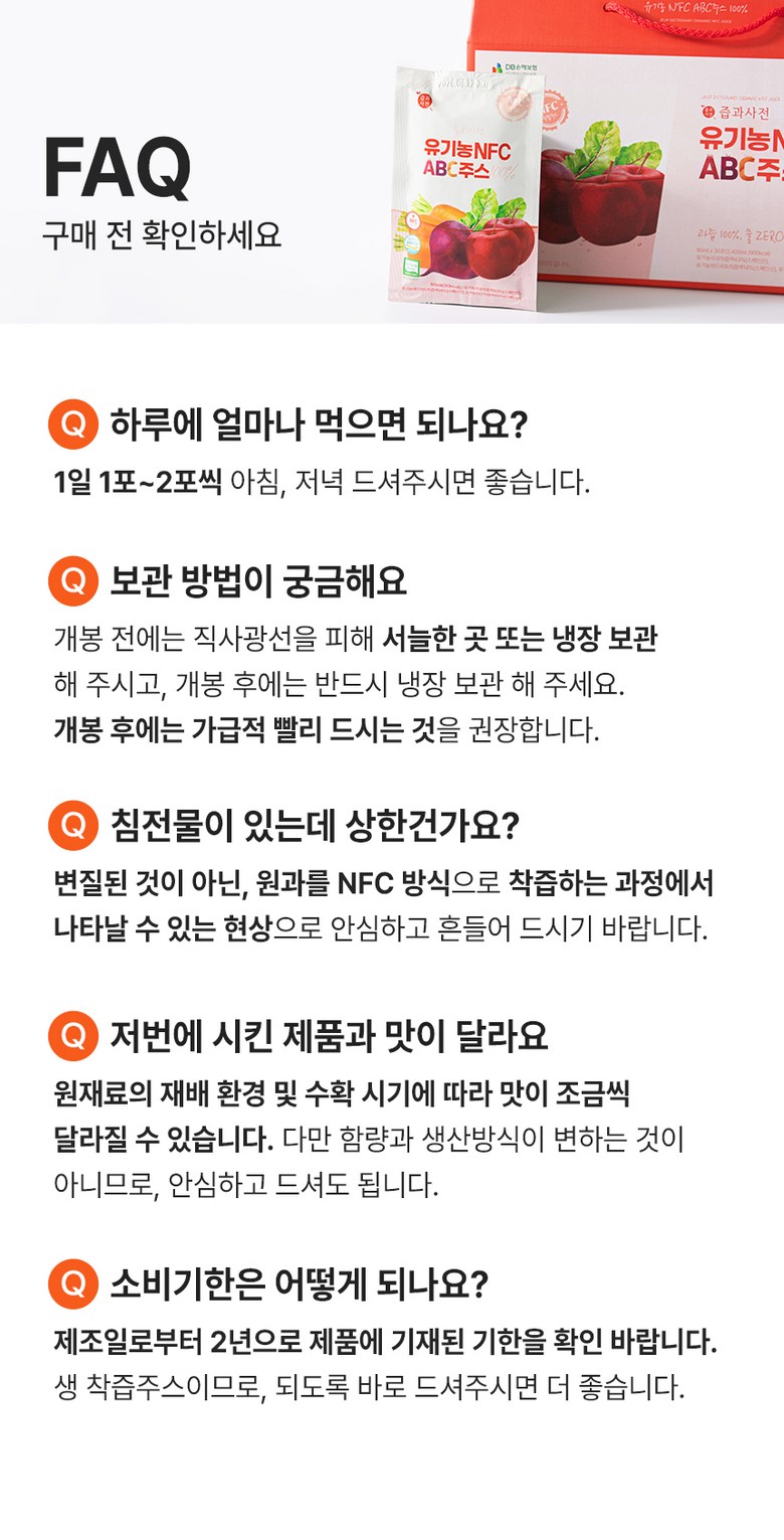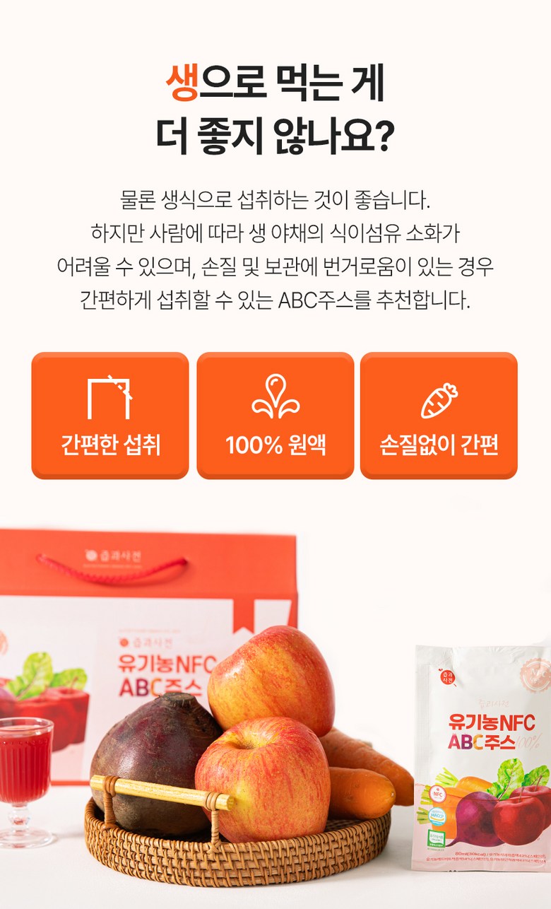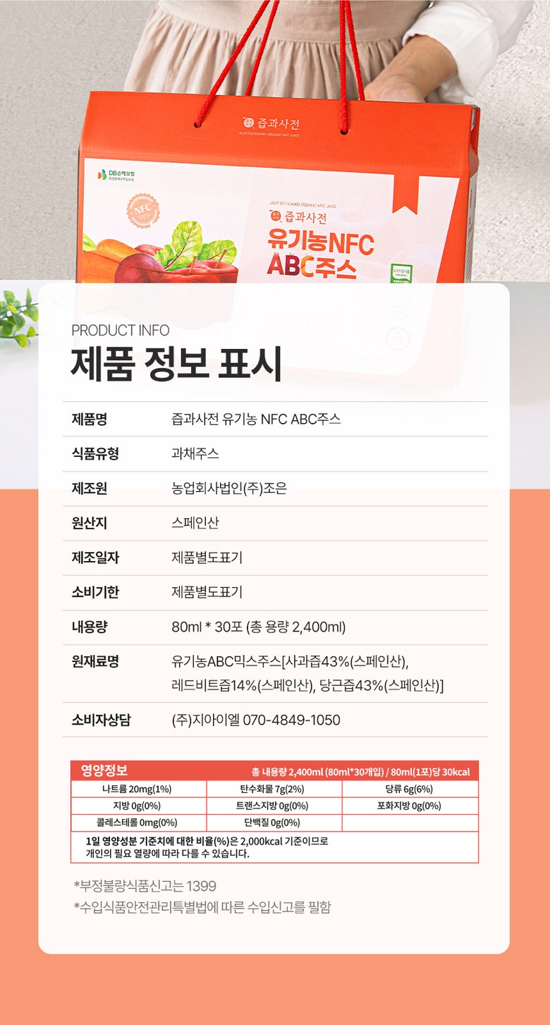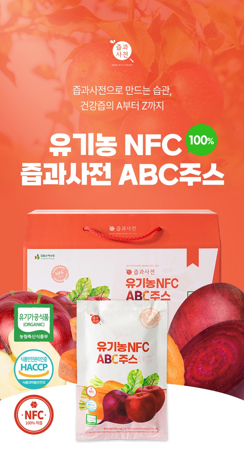 | 제품명 | 즙과사전 유기농 NFC ABC주스 착즙주스, 80ml, 30개 | 식품의 유형 | 상품 상세페이지 참조 |