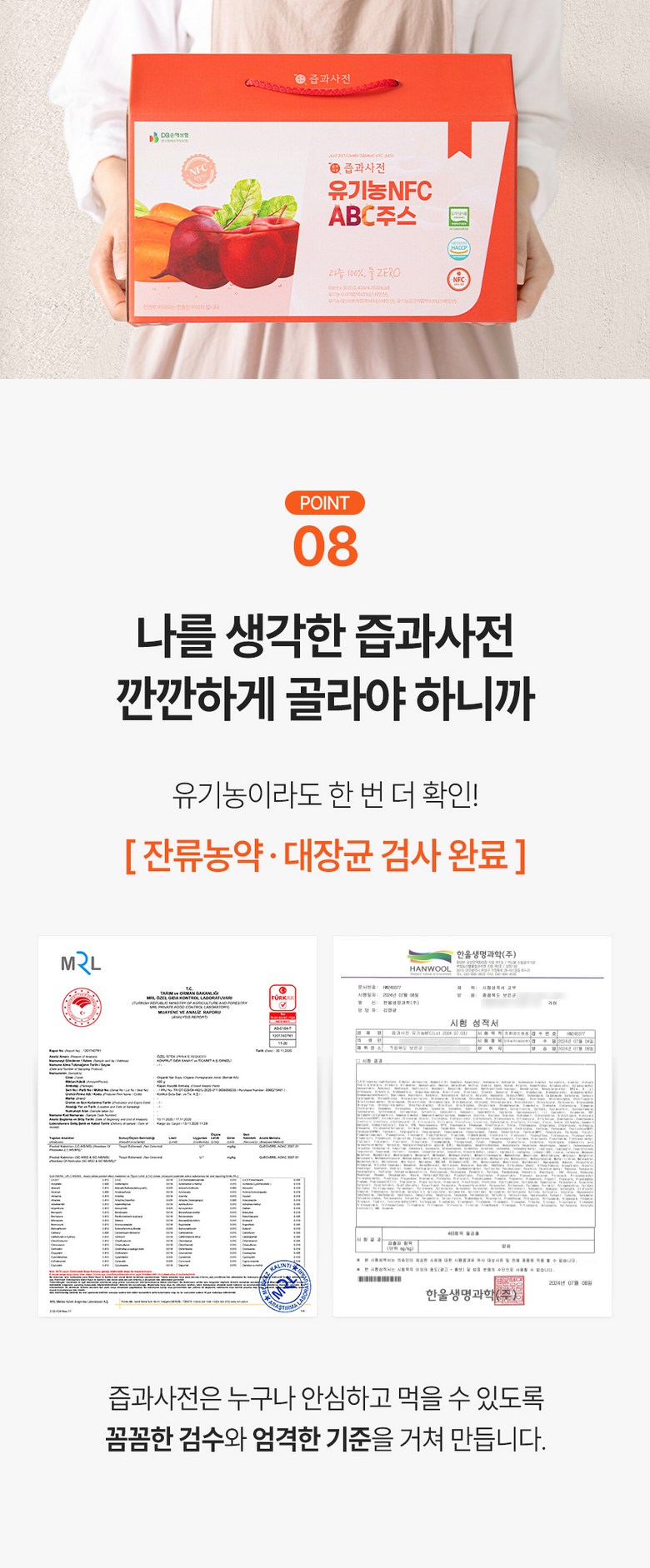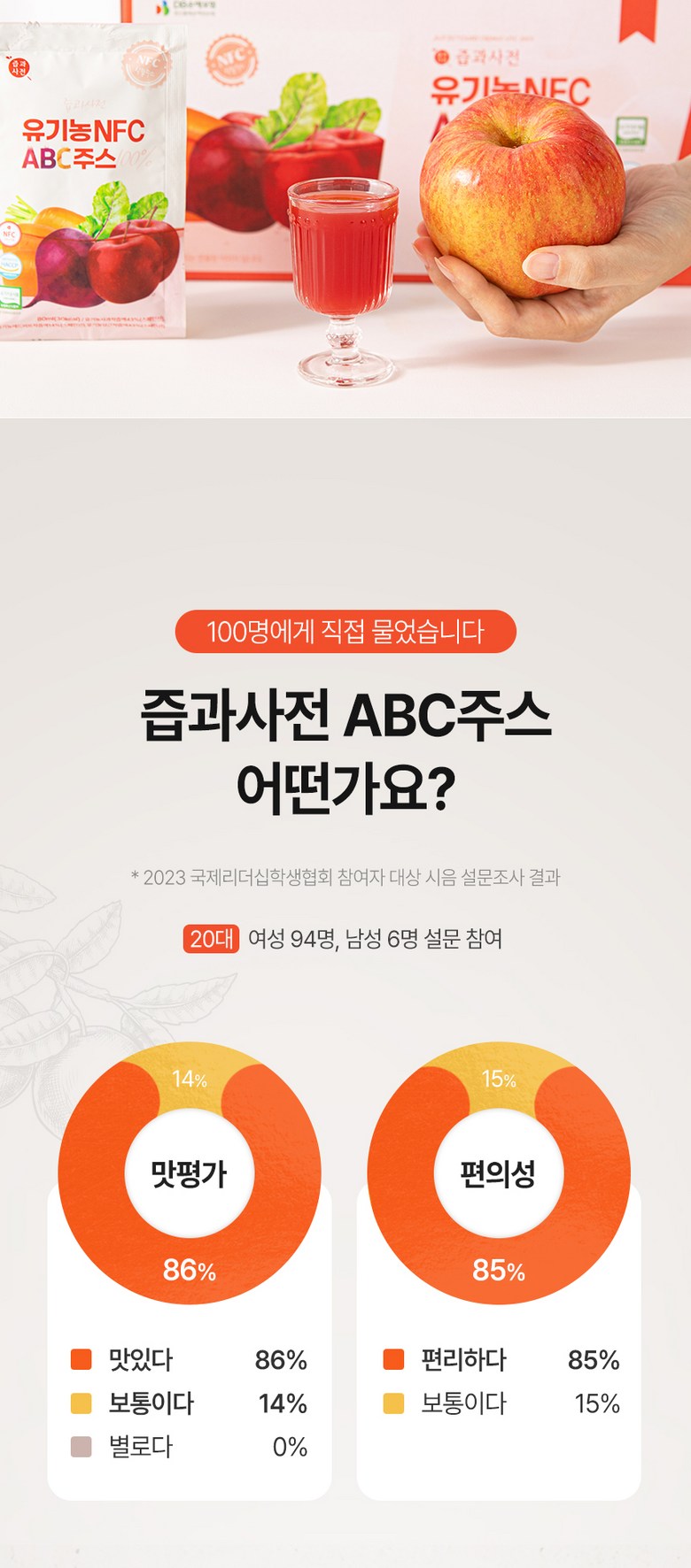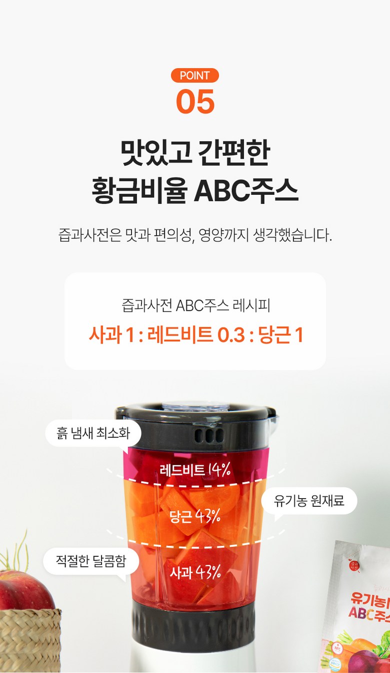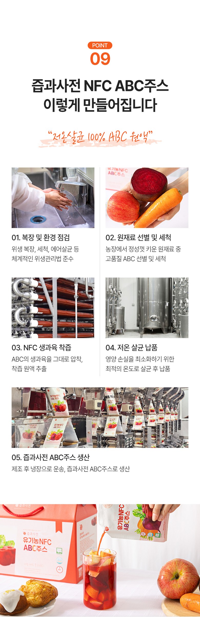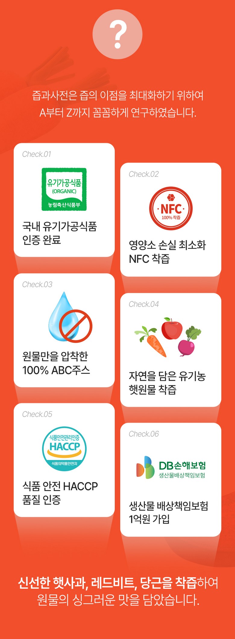 | 제품명 | 즙과사전 유기농 NFC ABC주스 착즙주스, 80ml, 30개 | 식품의 유형 | 상품 상세페이지 참조 |