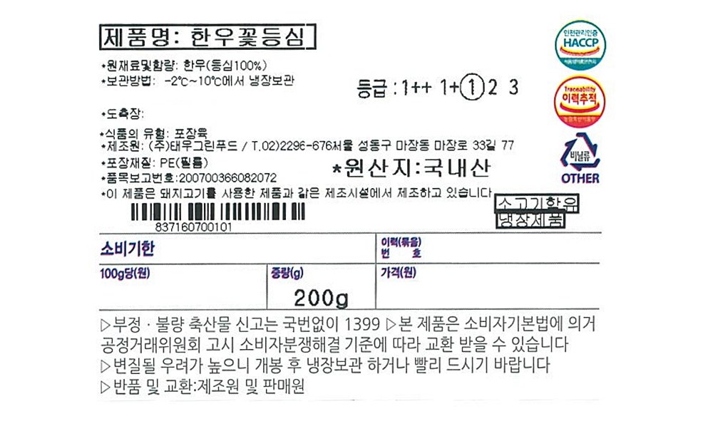 | 제조연월일, 소비기한 또는 품질유지기한 | 업데이트 예정 | 세부 품목군별 표시사항 | 축산물 등급표시 : 1등급 / 이력번호 표시유무 : 이력번호 표시제품임 |