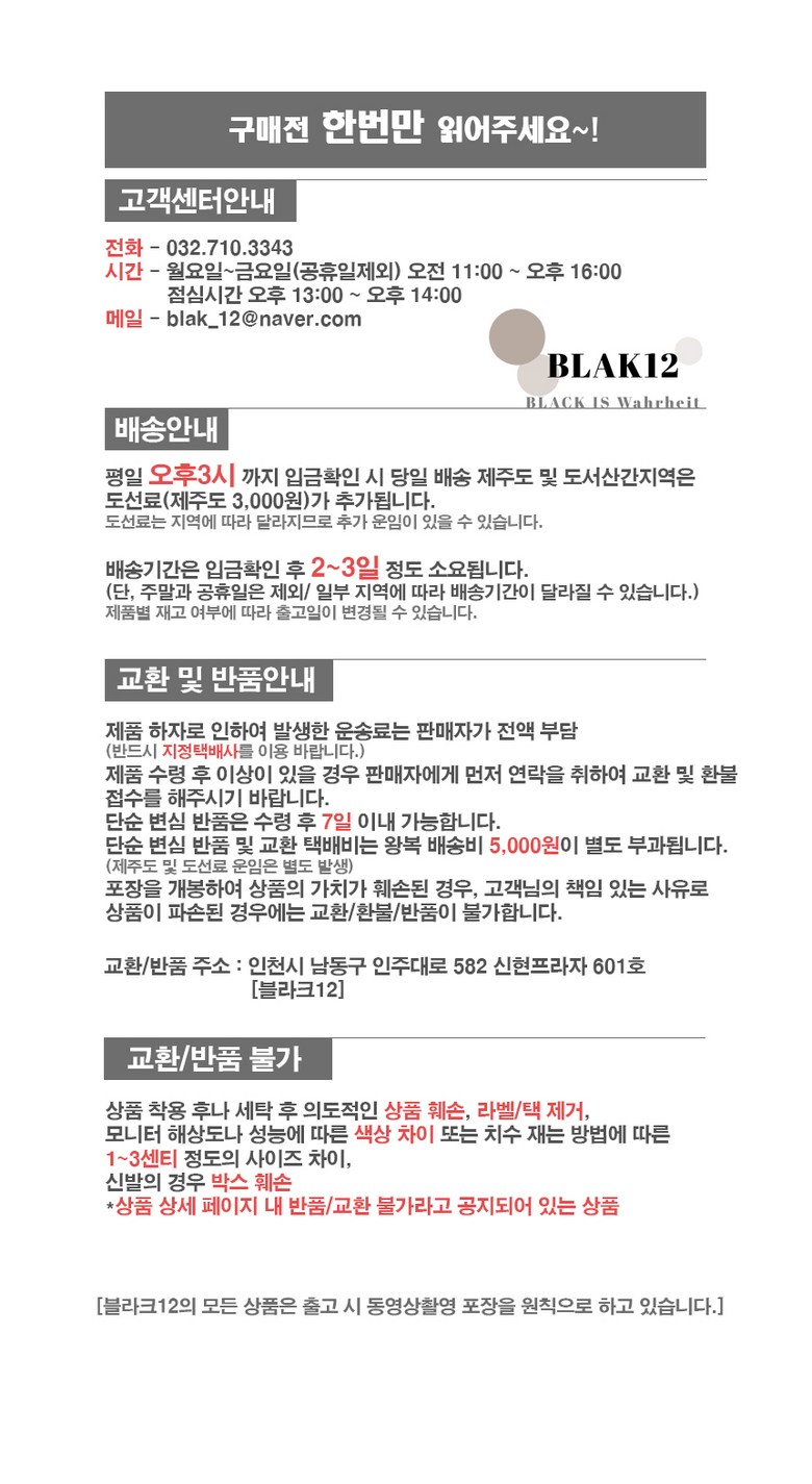 - ㆍ모니터 해상도의 차이로 인해 색상이나 이미지가 실제와 달라, 고객이 단순 변심으로 교환/반품을 무료로 요청하는 경우