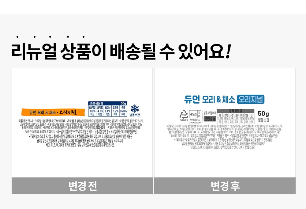 | 품명 및 모델명 | 듀먼 오리&채소 오리지널 | 인증/허가 사항 | 사료관리법에 따른 성분등록번호 : 컨텐츠 참조 |
