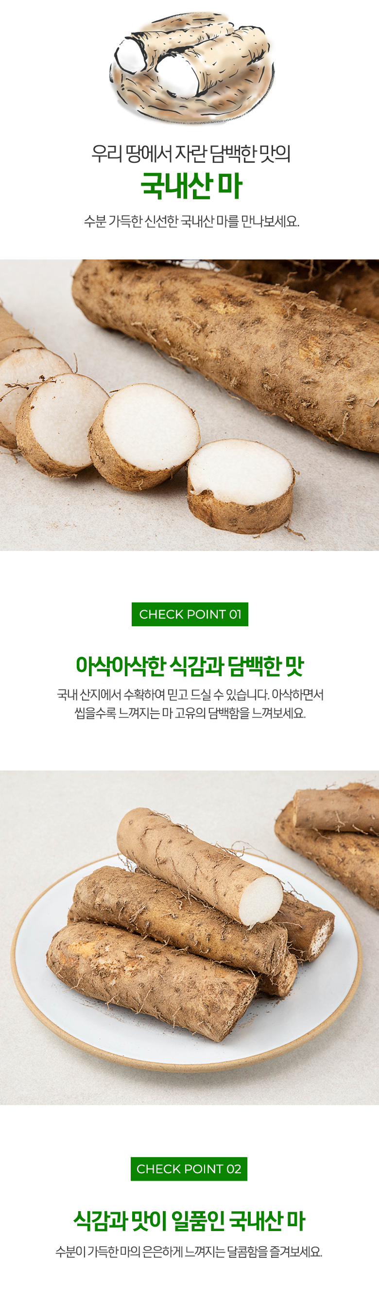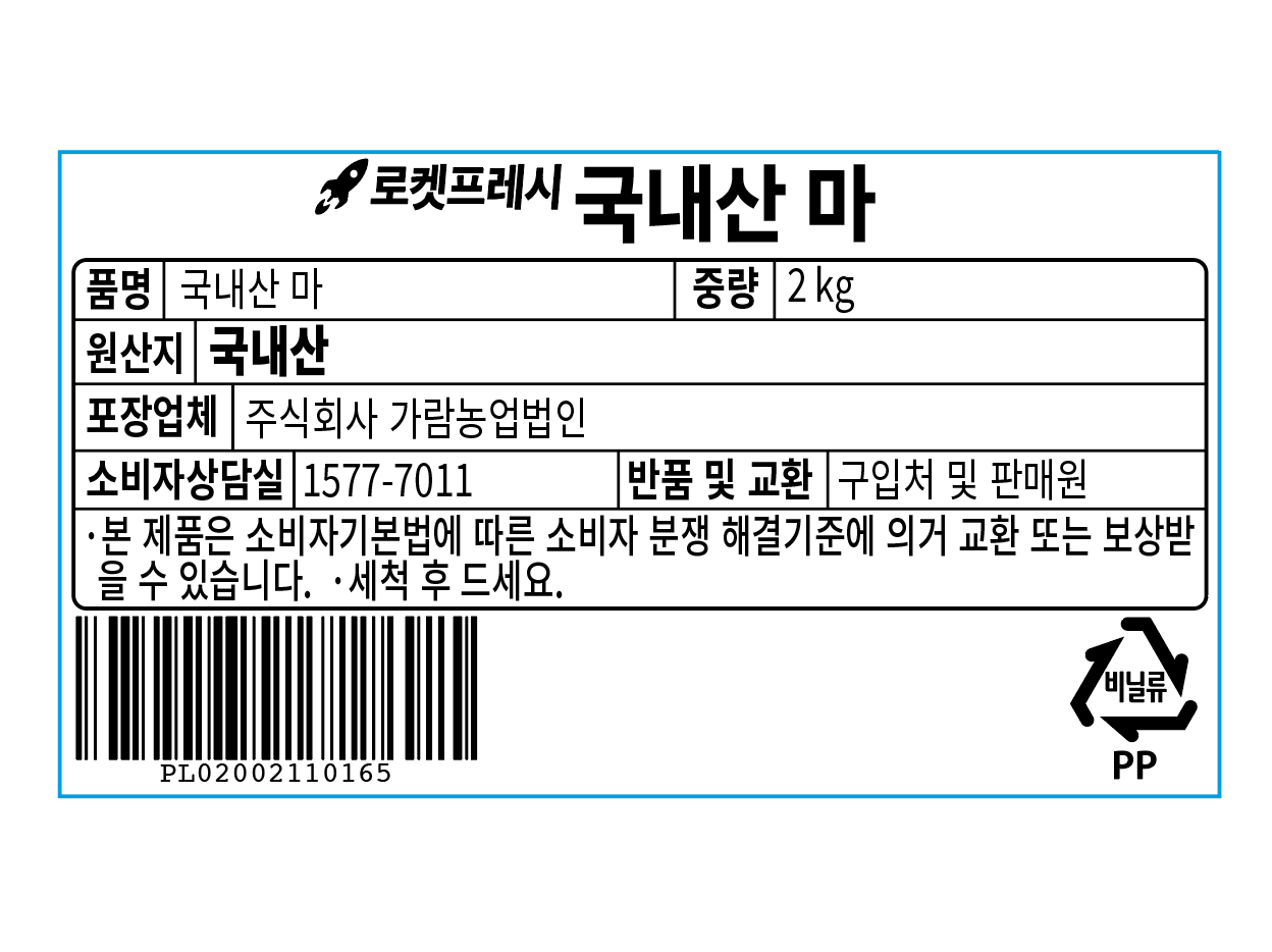 | 품목 또는 명칭 | 국내산 마 | 포장단위별 내용물의 용량(중량),수량,크기 | 2kgx1개 |