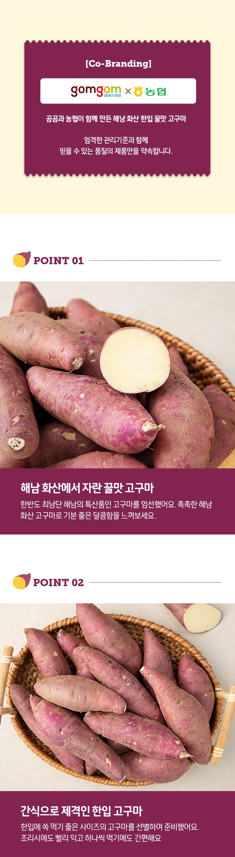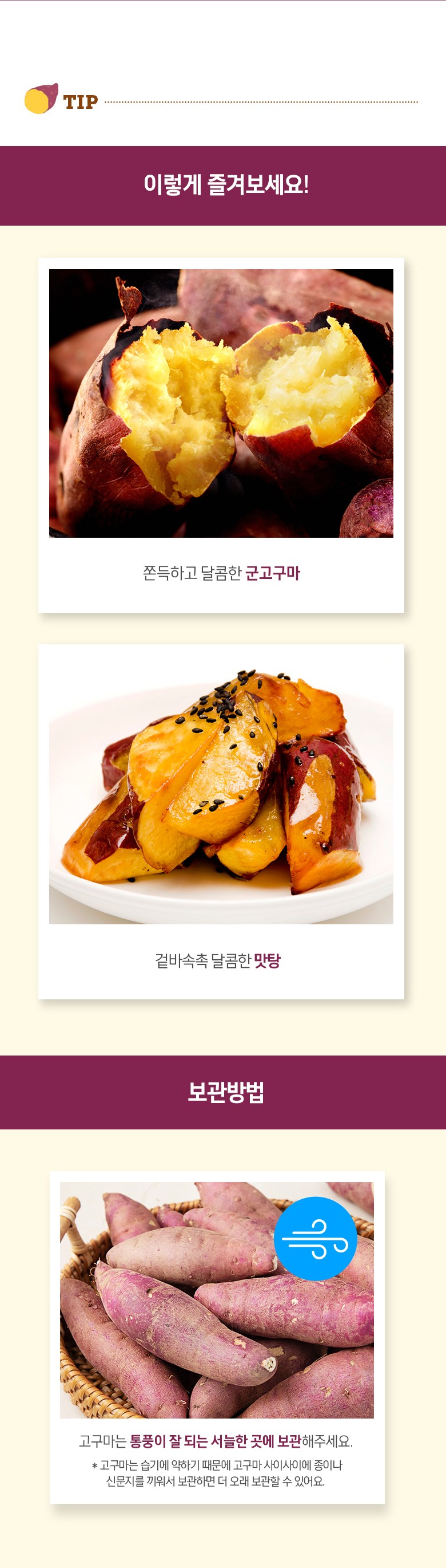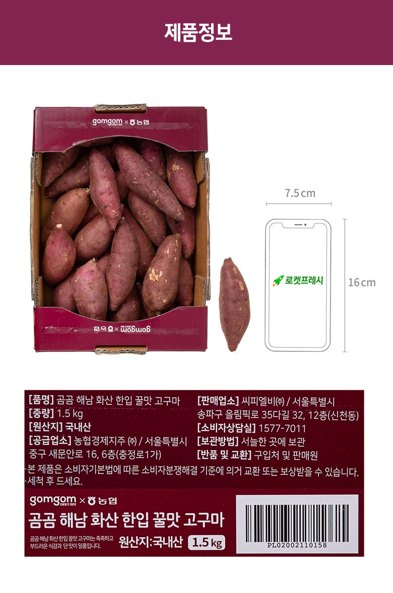 | 품목 또는 명칭 | 곰곰 해남 화산 한입 꿀맛 고구마 | 포장단위별 내용물의 용량(중량),수량,크기 | 1.5kgx1개 |