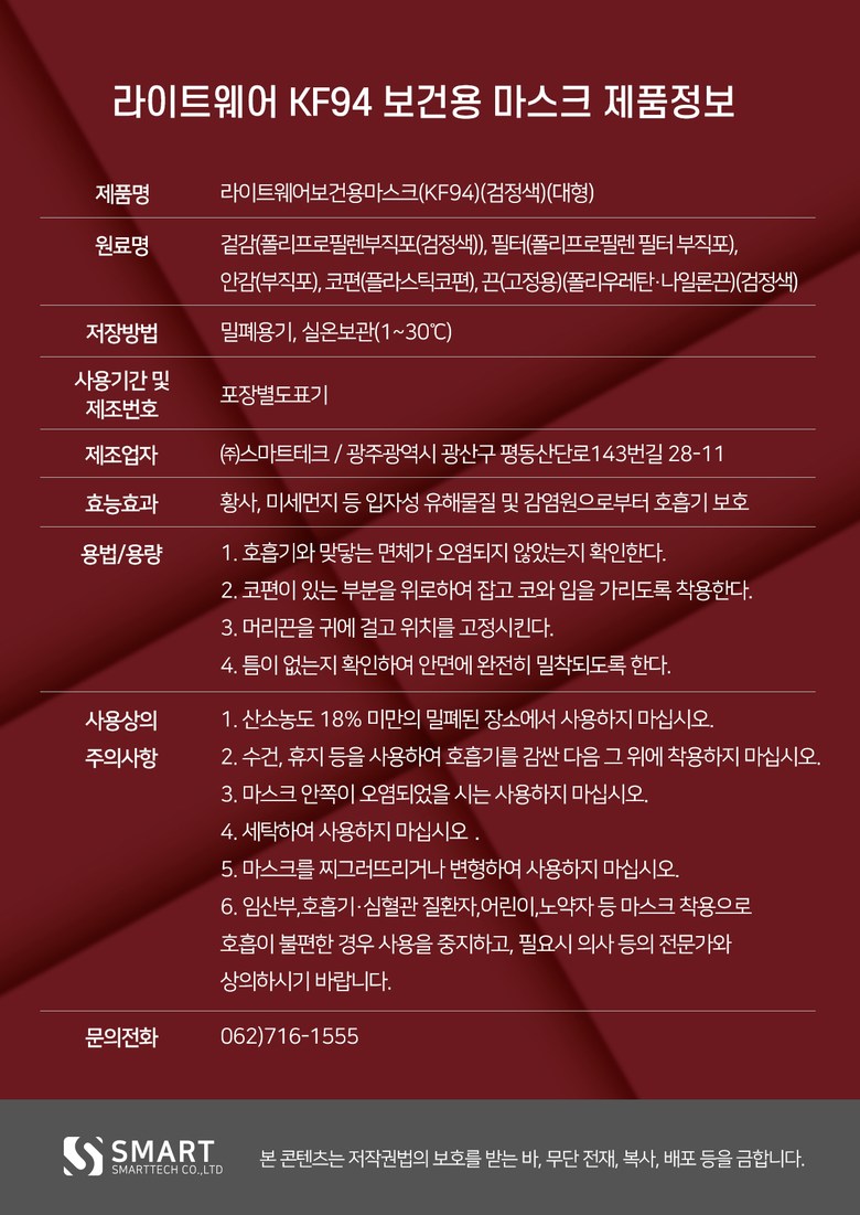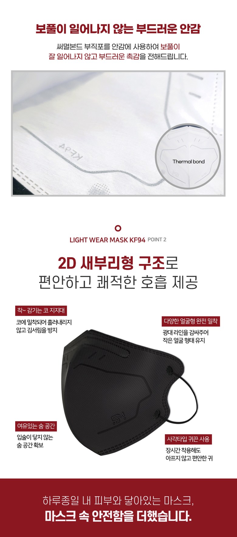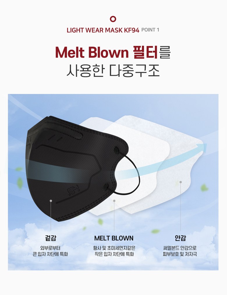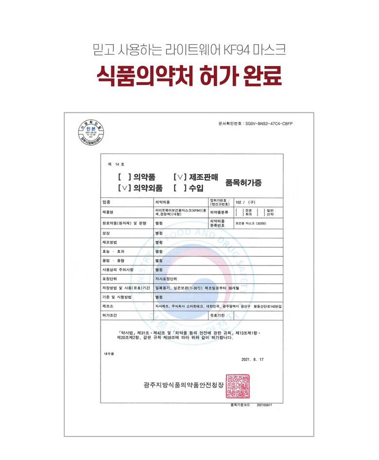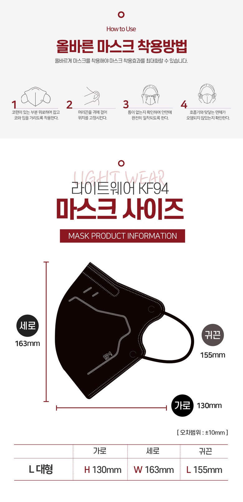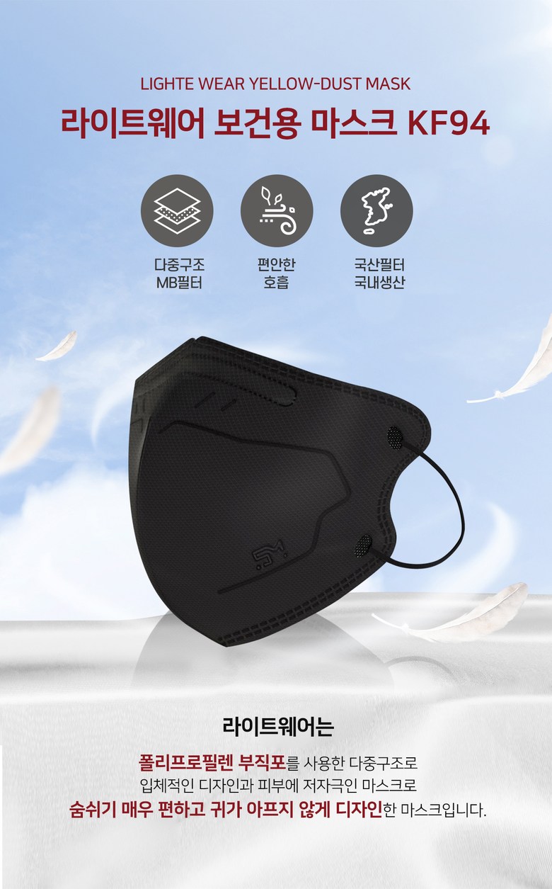| 품명 및 모델명 | 라이트웨어보건용마스크(KF94)(검정색)(대형) | 인증/허가 사항 | 의약외품 |