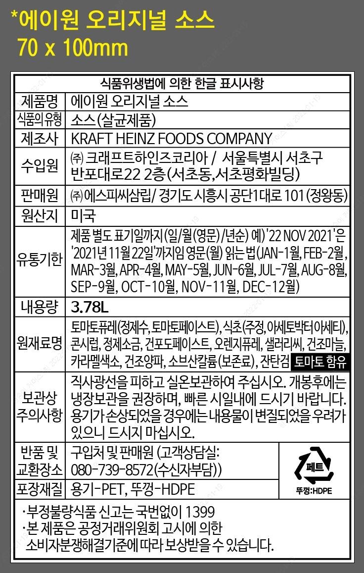| 제품명 | 에이원 오리지널 소스 | 식품의 유형 | 소스(살균제품) |