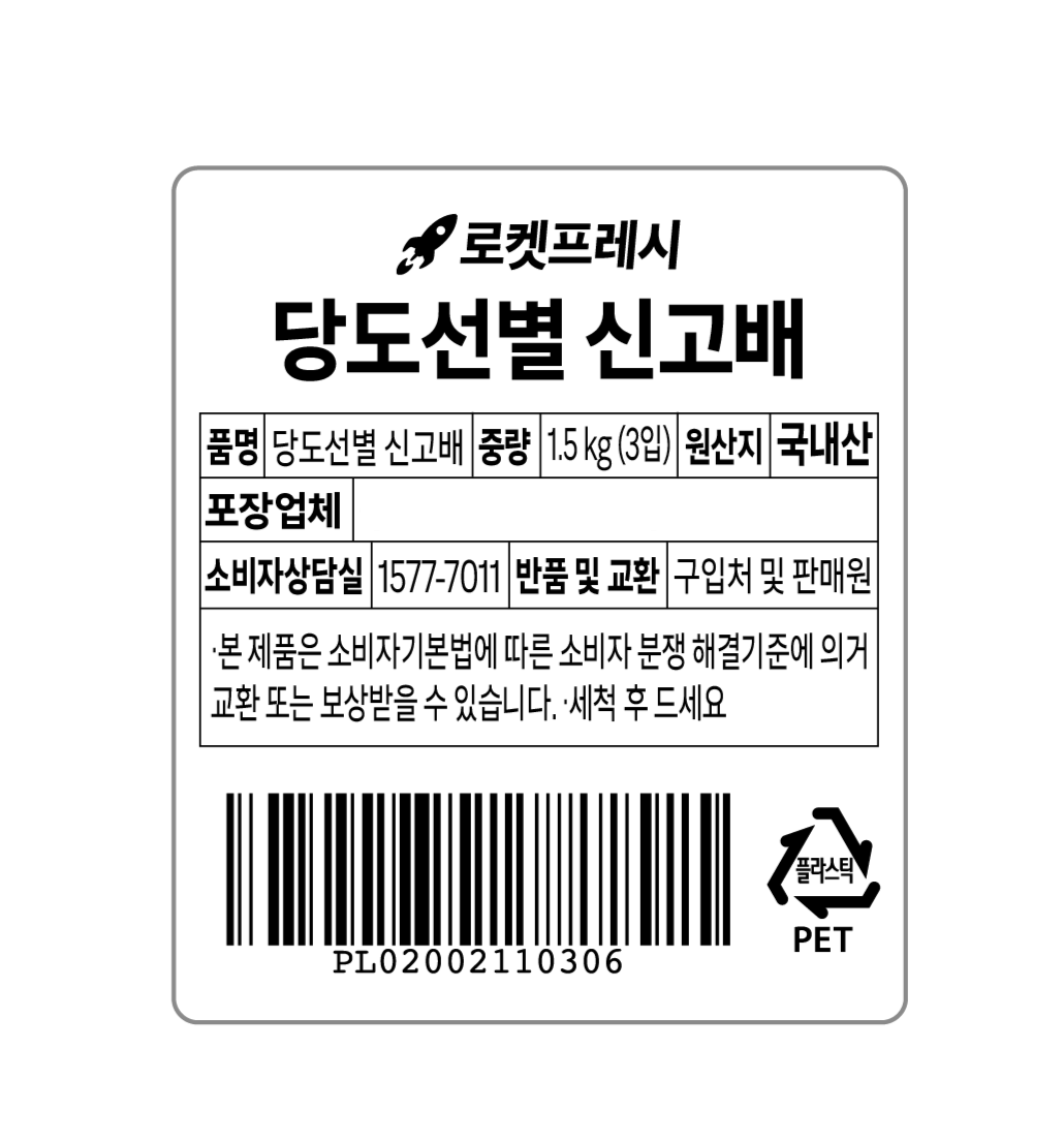 | 품목 또는 명칭 | 당도선별 신고배 | 포장단위별 내용물의 용량(중량),수량,크기 | 1.5kg(3입) x 3팩,1개 |