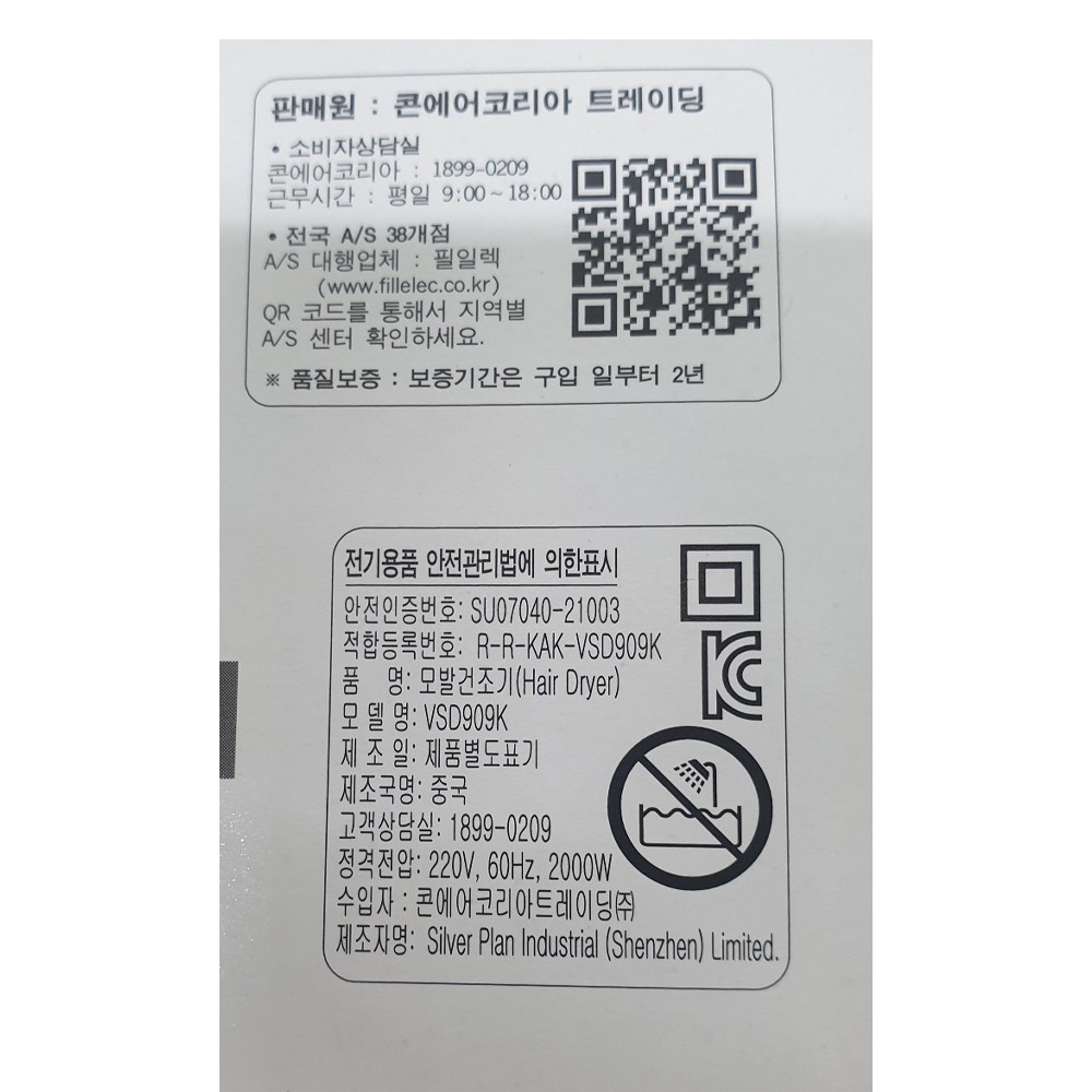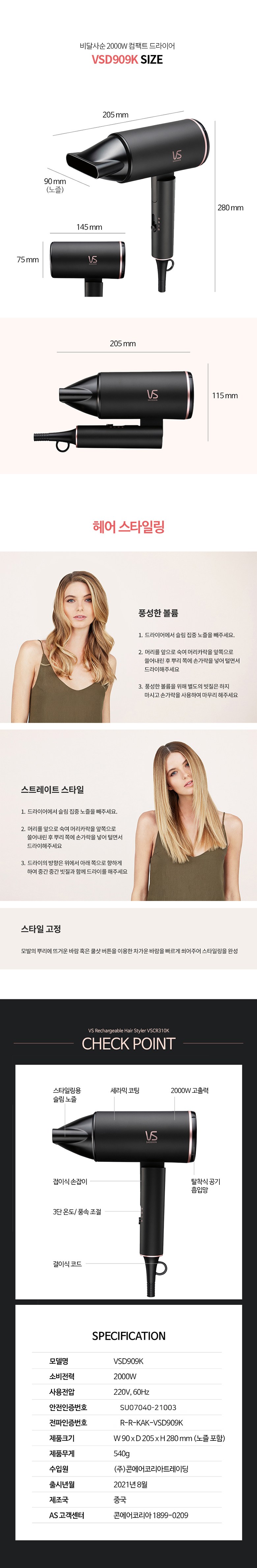 | 품명 및 모델명 | 모발건조기 VSD909K | KC 인증정보 | SU07040-21003, R-R-KAK-VSD909K |