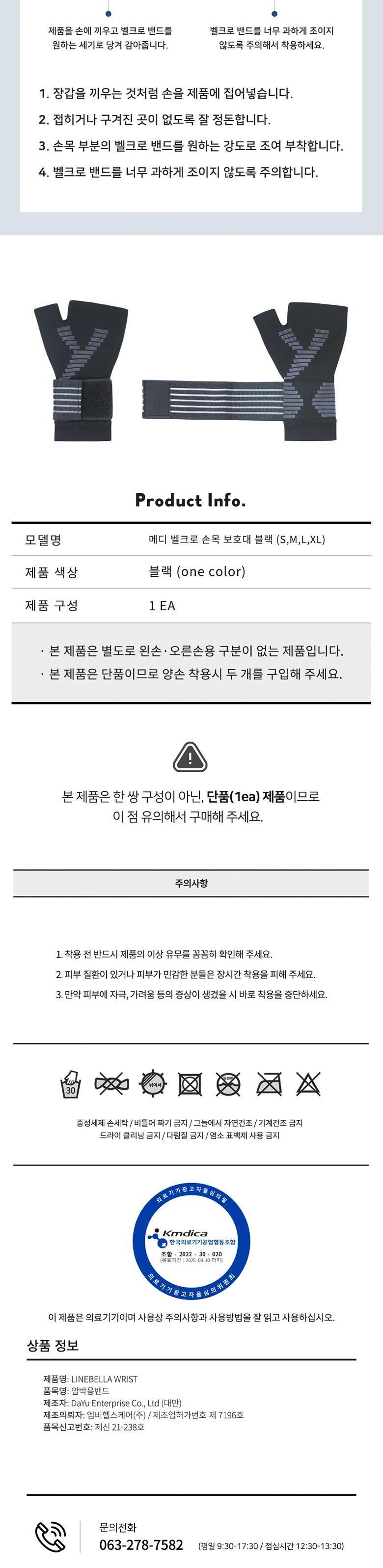 | 품명 및 모델명 | 압박용밴드 / 메디 벨크로 손목 보호대 블랙 M | 허가∙인증∙신고번호 (의료기기법에 따른 허가∙인증∙신고 대상 의료기기에 한함) | 제신21-238호(2021-02-24~2026-02-23) |