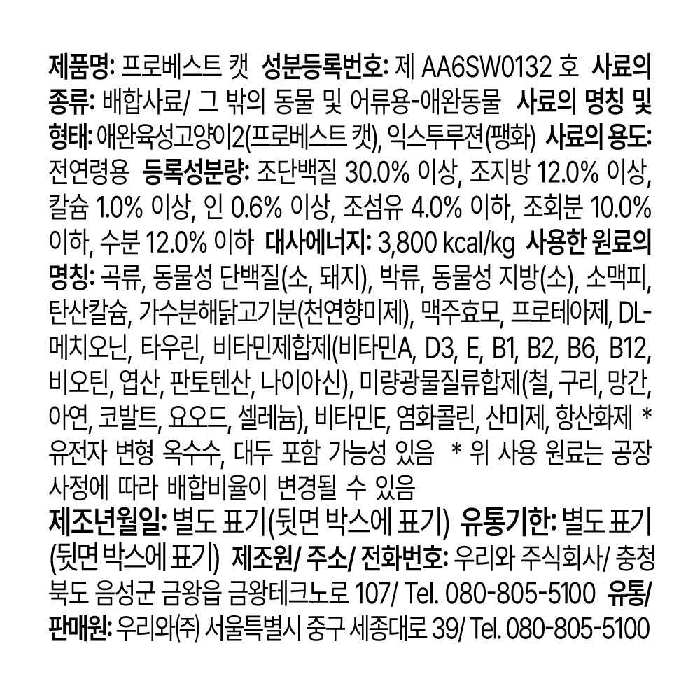 | 품명 및 모델명 | 프로베스트캣 | 인증/허가 사항 | 사료관리법에 따른 성분등록번호 : 컨텐츠 참조 |
