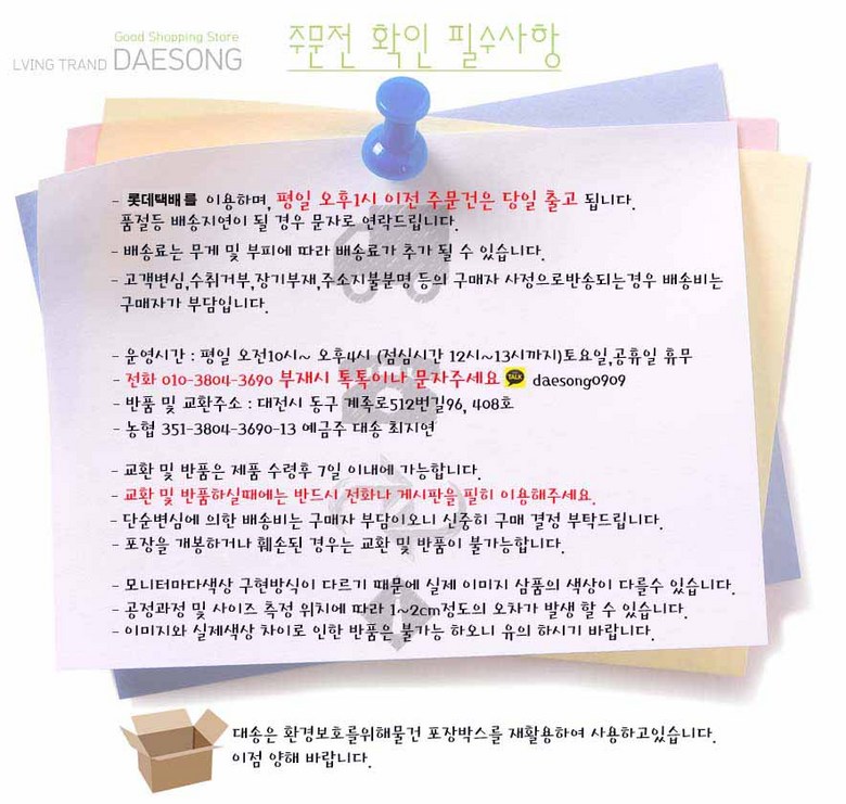 - ㆍ모니터 해상도의 차이로 인해 색상이나 이미지가 실제와 달라, 고객이 단순 변심으로 교환/반품을 무료로 요청하는 경우
