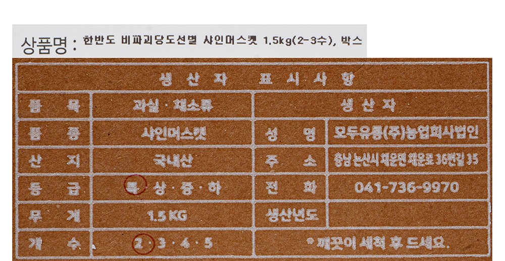 | 제조연월일, 소비기한 또는 품질유지기한 | 업데이트 예정 | 세부 품목군별 표시사항 | 농수산물 : 유전자변형(해당 없음) / 지리적 표시사항(해당 없음) |