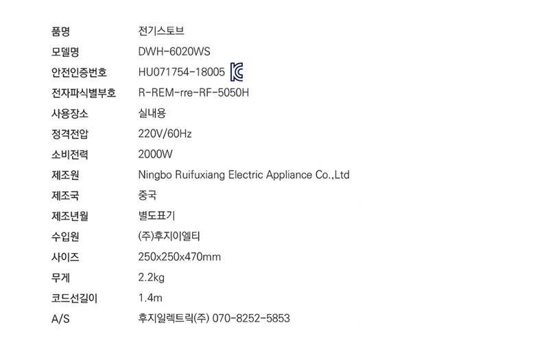 | 품명 및 모델명 | 전기스토브 DWH-6020WS | KC 인증정보 | HU071754-18005C, R-REM-rre-RF-5050H |