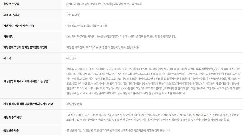 | 화장품제조업자, 화장품책임판매업자 및 맞춤형화장품판매업자 | 상품 상세페이지 참조 | 제조국 | 상품 상세페이지 참조 |