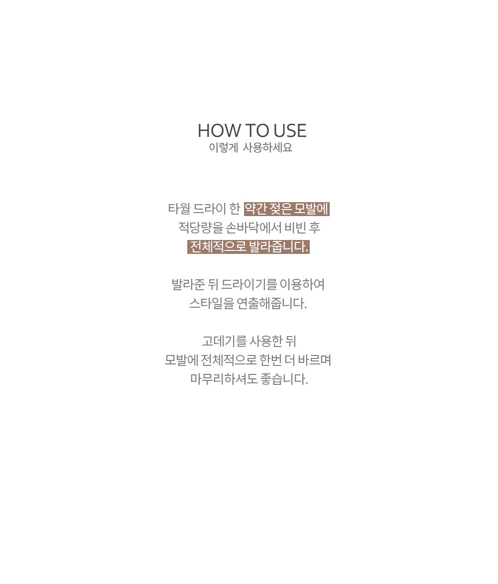| 사용기한 또는 개봉 후 사용기간 | 본 상품은 해당 물류센터 직발송 상품인 관계로 제조연월일 및 사용기한 정보가 매번 변경되므로 상단 사용기한 정보를 참고해 주세요. | 사용방법 | 샴푸 후 타올드라이한 모발에 전체적으로 부드럽게 도포해 줍니다. 도포한 후 컬링매직기나 드라이기를 이용하여 스타일을 연출해줍니다. |