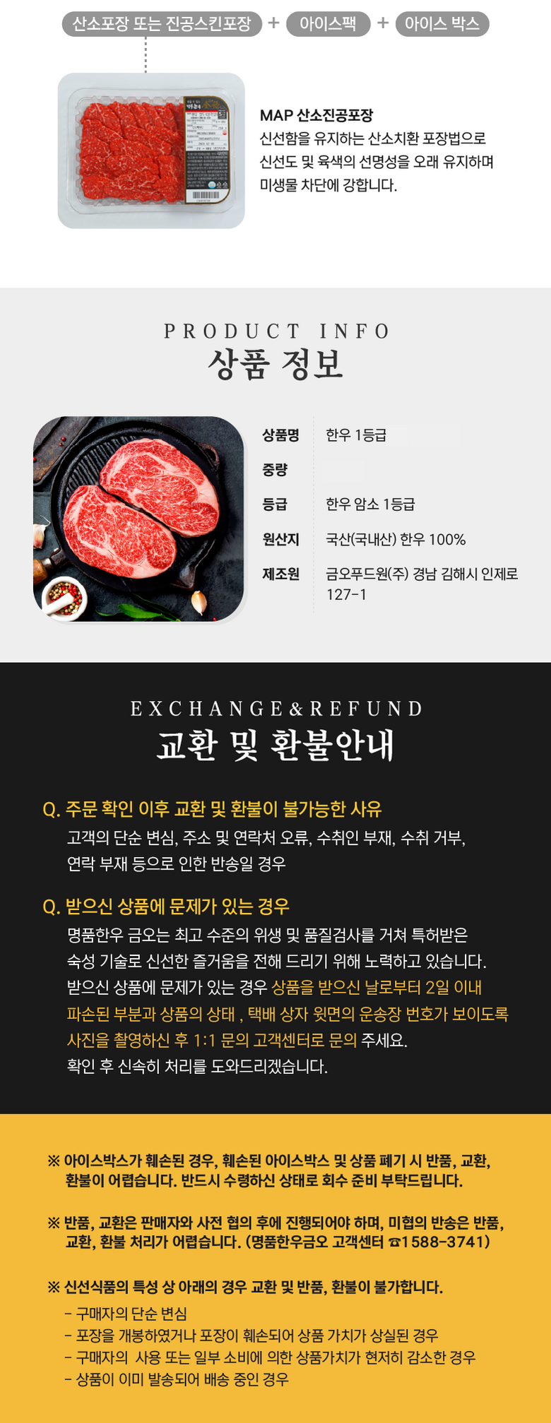 | 제조연월일, 소비기한 또는 품질유지기한 | 주문일로부터 1~2일 이내/소비기한-수령후 2~3일 섭취 권장, 제조일로부터 30일이내, 입고일 및 제조일이 상이하여 고객님께 배송될 상품의 제조연월일이 파악되지 않습니다. 정확한 제조연월일을 확인하시려면 (명품한우금오 소비자상담실 1588-3741)로 문의하시기 바랍니다. | 세부 품목군별 표시사항 | 한우 1등급, 배송되는 축산물 상품에는 이력번호가 표시되어 있습니다. 국내산 축산물은 www.mtrace.go.kr 에서 조회가능합니다. |