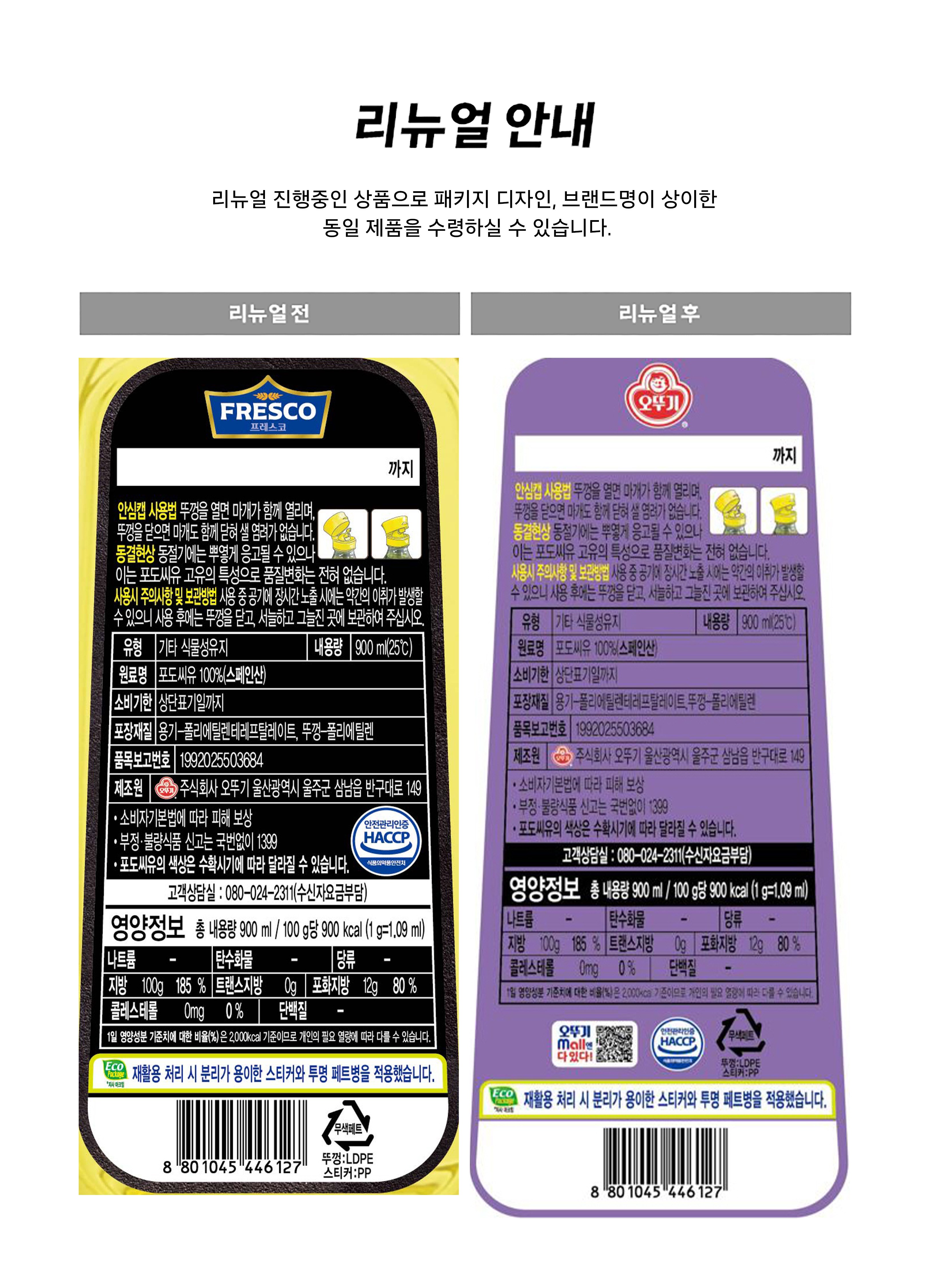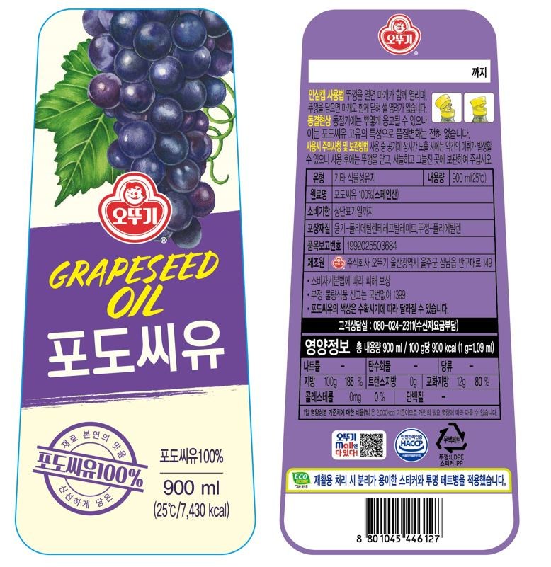 | 제품명 | 오뚜기 포도씨유 | 식품의 유형 | 컨텐츠 참조 |
