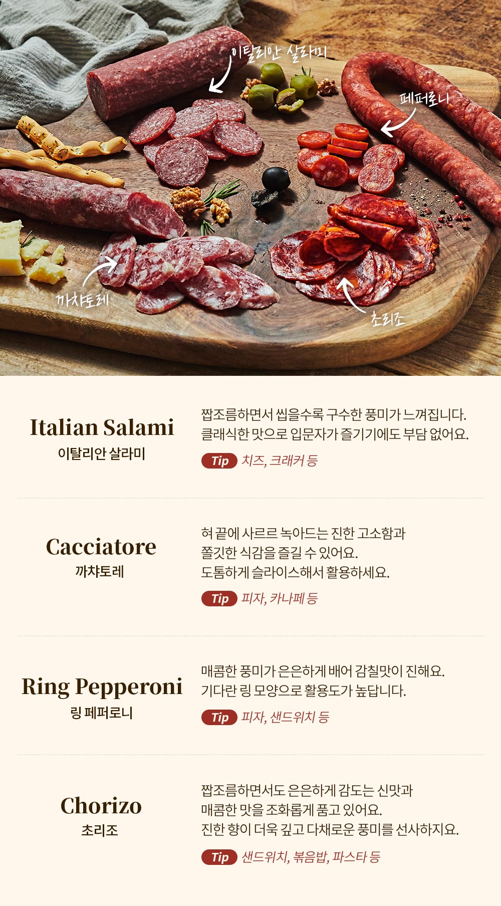 발효소시지인 '까챠토레'는 고소한 풍미가 진한 것이 특징인데요. 트러플 베이스를 넣어 색다른 풍미를 더한 존쿡 델리미트의 까챠토레를 경험해보세요. 쫀득쫀득하게 씹히며 혀 끝에 눅진하게 녹아드는 감칠맛을 선사할 거예요.
