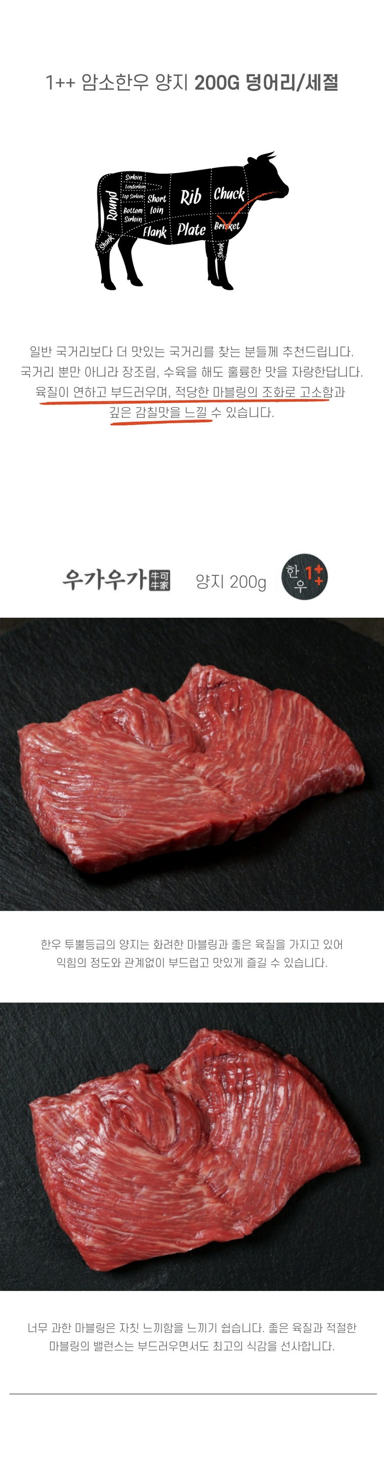 | 품목 또는 명칭 | 암소한우 1++등급 투뿔 양지 덩어리 국거리용 | 포장단위별 내용물의 용량(중량),수량,크기 | 300g 1팩 |