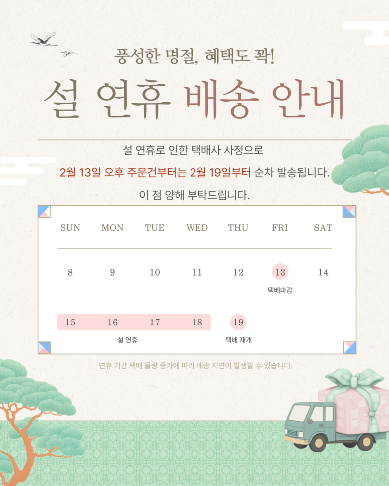 | 배송기간 | ㆍ도서산간 지역 등은 배송에 3-5일이 더 소요될 수 있습니다. - 천재지변, 물량 수급 변동 등 예외적인 사유 발생 시, 다소 지연될 수 있는 점 양해 부탁드립니다. | ||