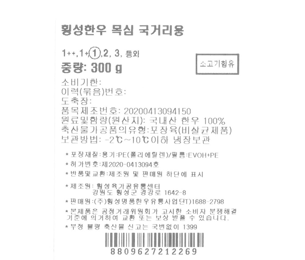 | 품목 또는 명칭 | 횡성한우 목심 국거리용 | 포장단위별 내용물의 용량(중량),수량,크기 | 300g,1개 |