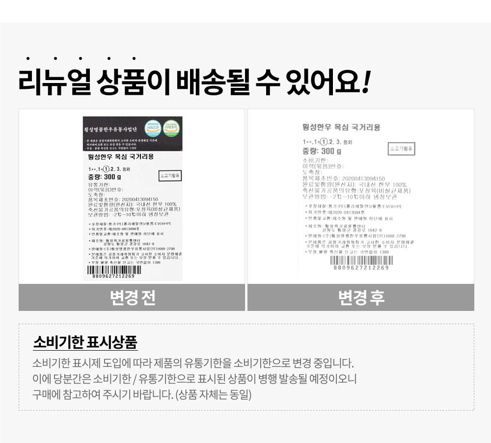 | 소비기한 또는 품질유지기한 | 소비기한(또는 유통기한) : 2026년 03월 05일 이거나 그 이후인 상품 | 세부 품목군별 표시사항 | 축산물 등급 표시 - 1등급 이상 / 이력번호 표시유무 - 이력번호 표시제품임 |