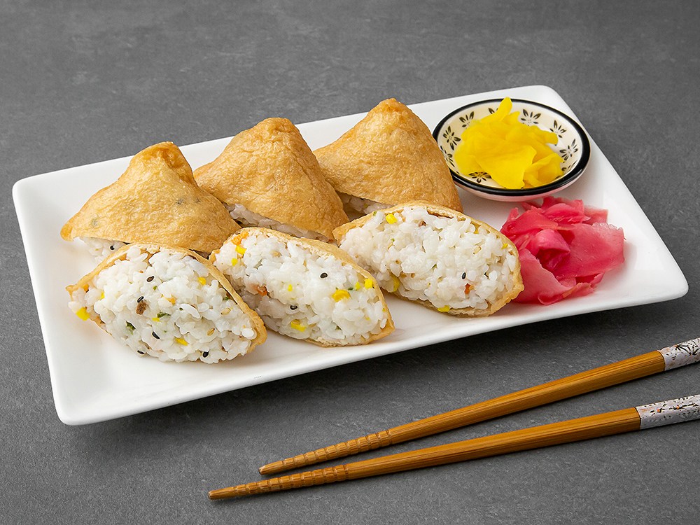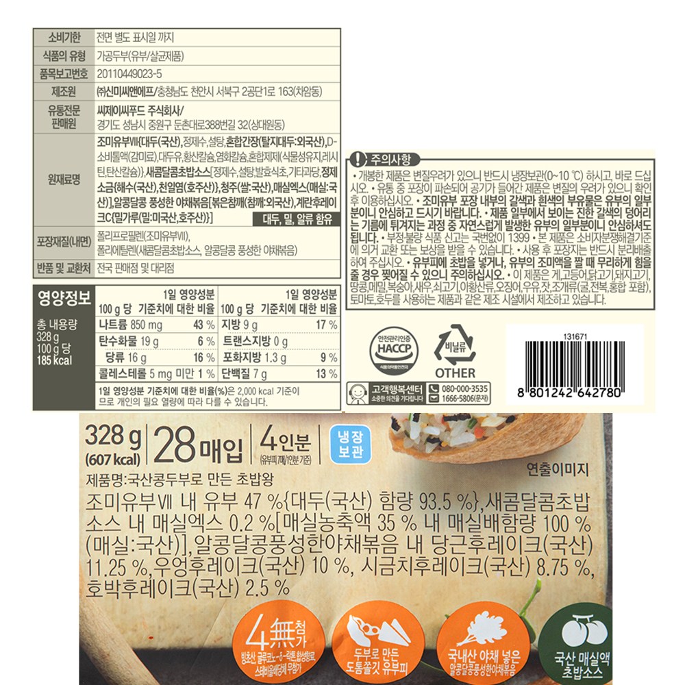 조미유부, 새콤달콤 초밥소스, 알콩달콩 풍성한 야채볶음으로 구성되어 있습니다.