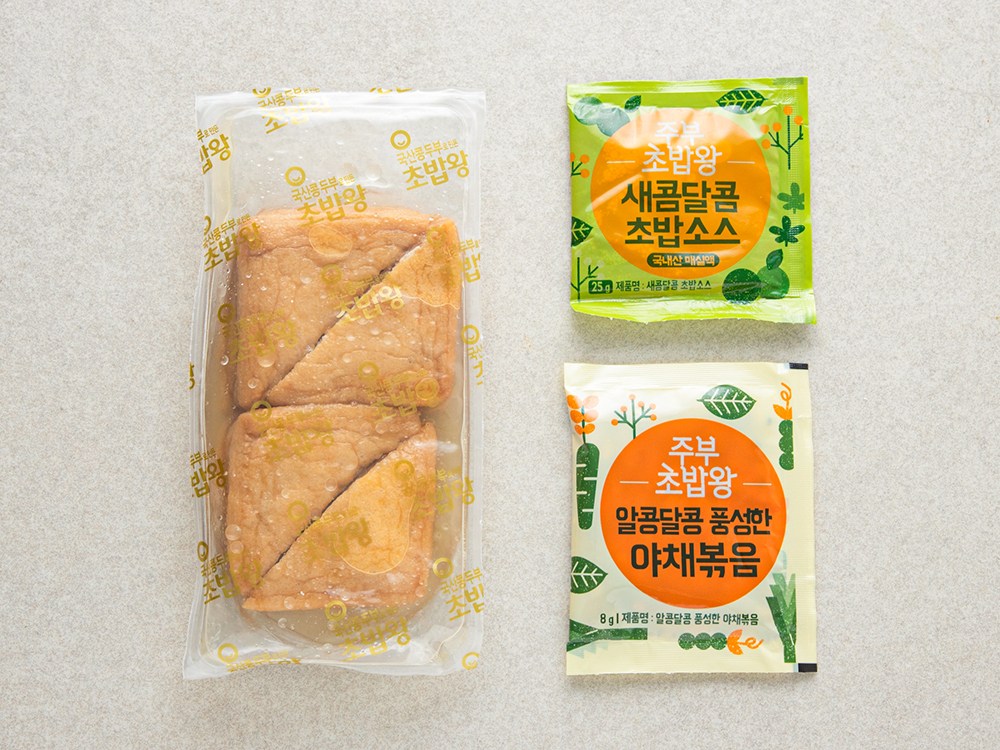 유부초밥은 도시락 메뉴로도, 든든한 간식으로도 제격인데요. 도톰하고 쫄깃쫄깃한 유부초밥을 손쉽게 완성해보세요. 초밥소스와 야채볶음이 동봉되어 있어, 밥만 준비하면 금세 만들 수 있답니다. 두부 특유의 고소함이 살아있어 고소하면서, 새콤 달달한 감칠맛으로 입맛을 사로잡을 거예요.
