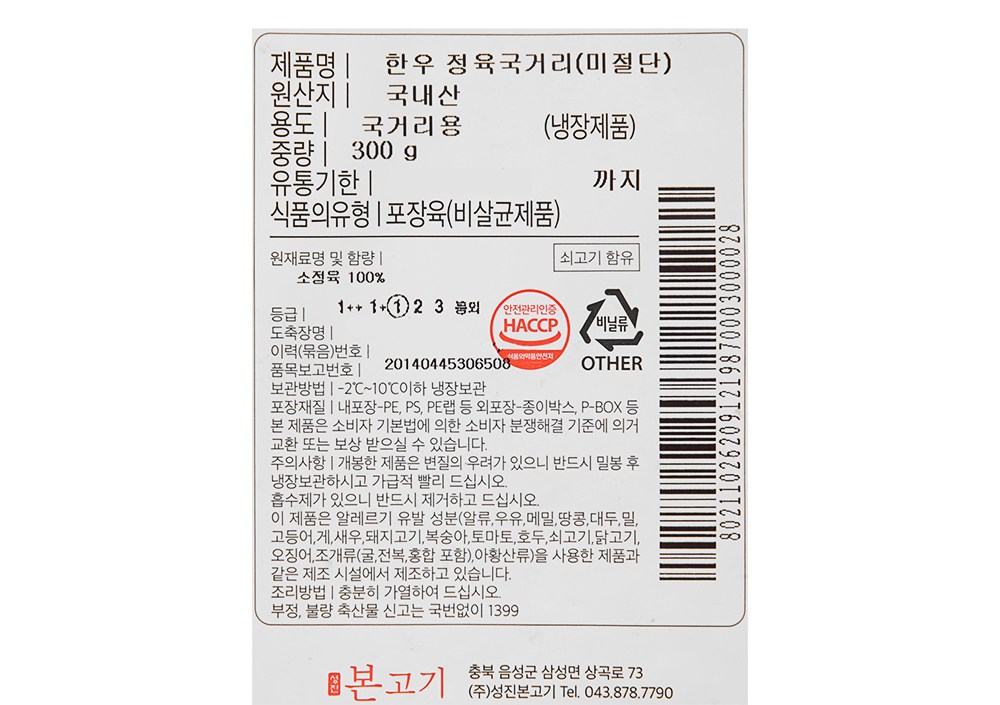 | 품목 또는 명칭 | 한우 정육국거리(미절단) | 포장단위별 내용물의 용량(중량),수량,크기 | 300g,1개 |