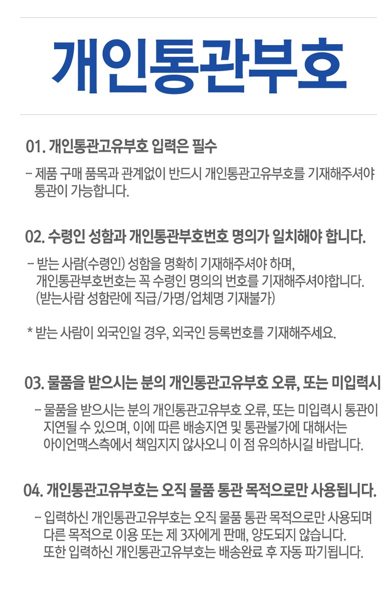 - 법규 개정에 따라 개인통관고유부호 검증 절차가 강화되었습니다. 결제 단계에서 받는 사람의 정보가 관세청 등록 정보 (성명, 휴대폰, 개인통관고유부호, 주소) 와 일치하는지 확인해주세요.