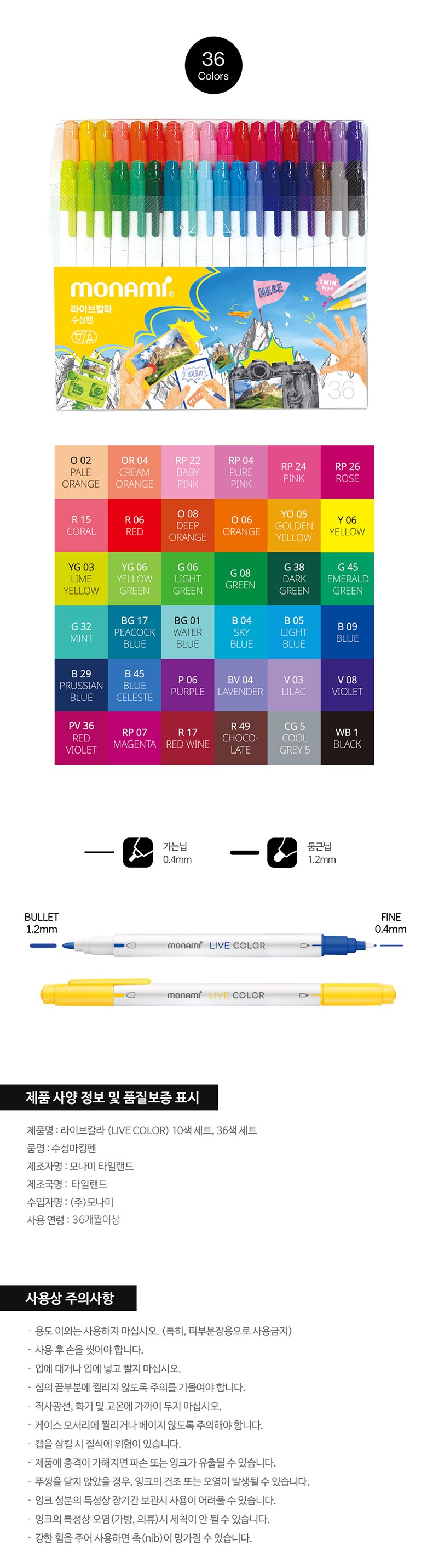| 품명 및 모델명 | 모나미 라이브칼라 트윈타입 사인펜 36색, 혼합 색상 | KC 인증정보 | CB117R032-1002 |