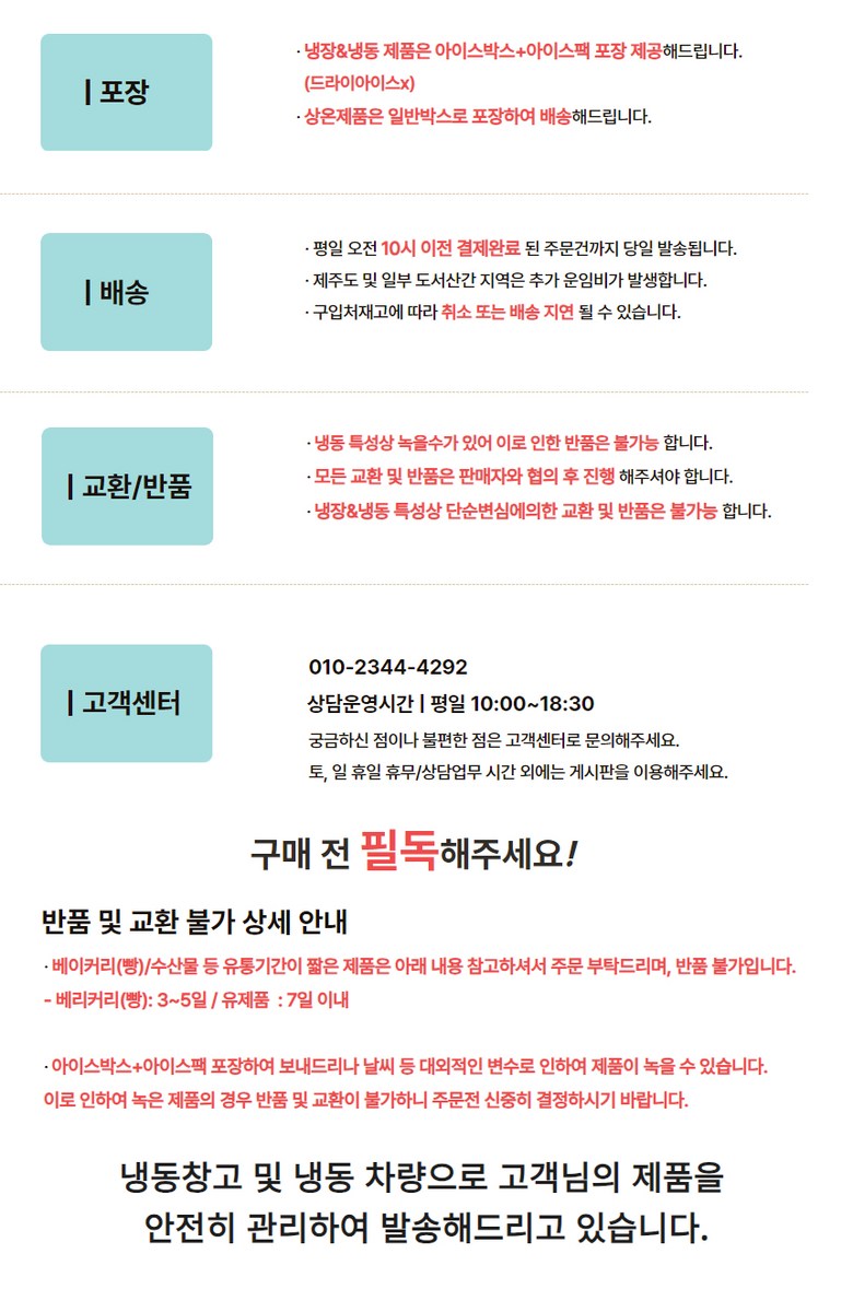 | 배송방법 | 신선/냉장/냉동 | 배송비 | 3,000원 - 도서산간 지역 배송불가 |