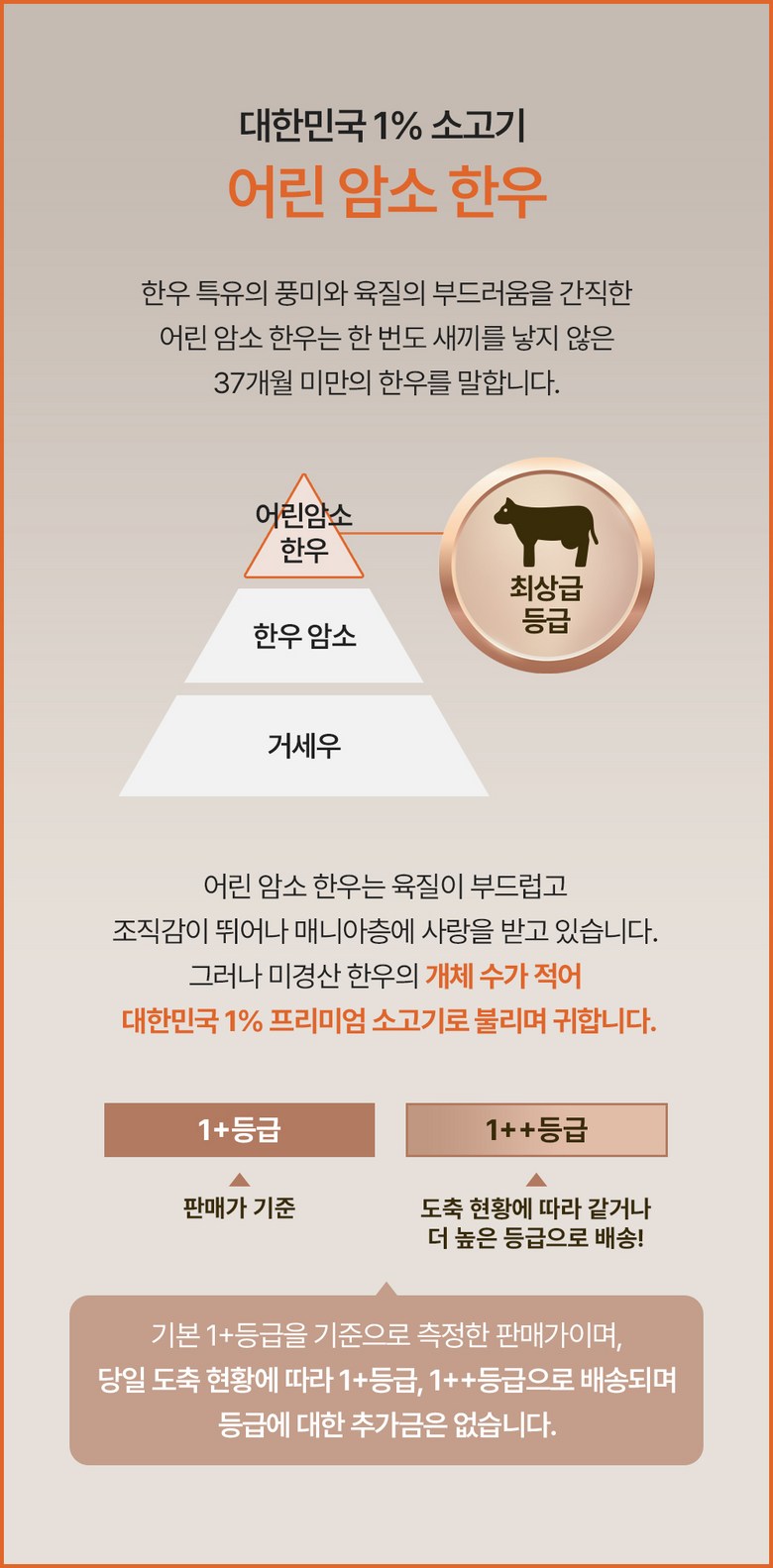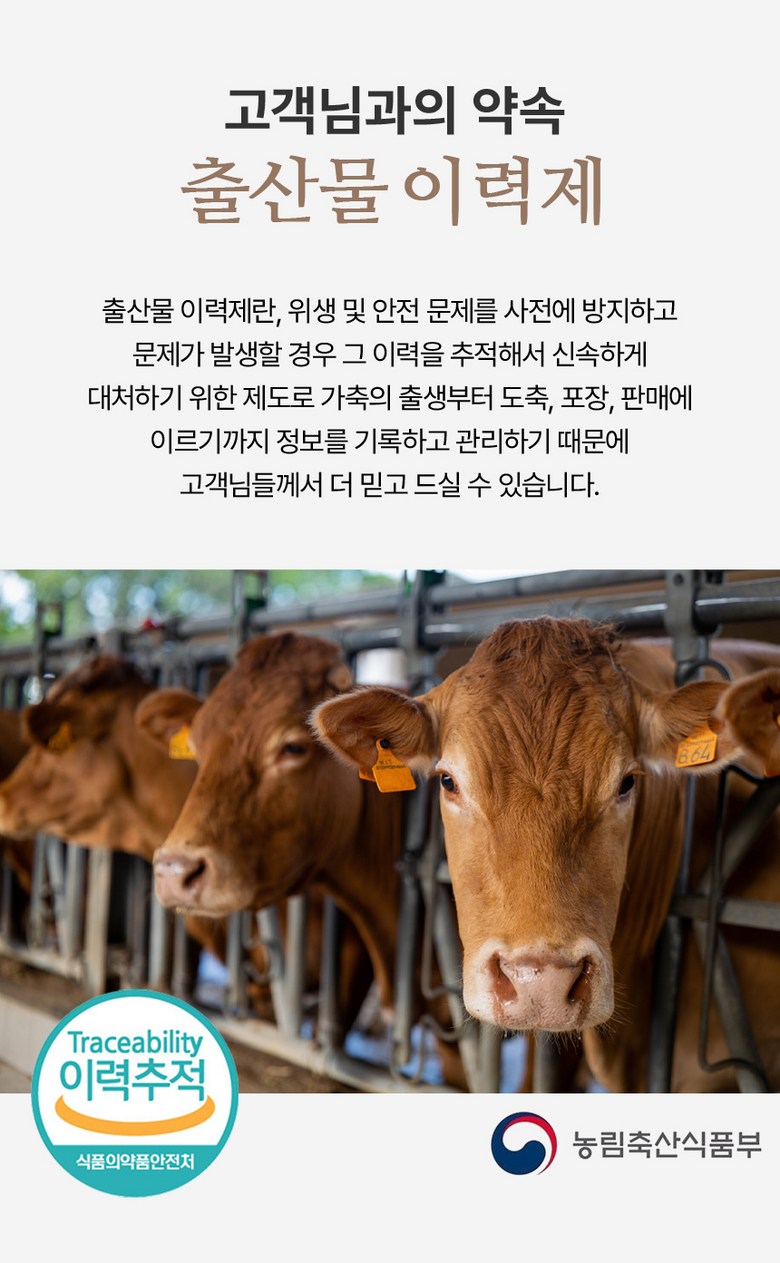 | 제조연월일, 소비기한 또는 품질유지기한 | 제조년월일 : 출고일 이전 7일이내 인 제조상품소비기한(또는 유통기한) : 출고일 기준, 소비기한 만기 15일 이내상품 수령 후 5일 이내 섭취 권장 | 세부 품목군별 표시사항 | 축산물 등급 표시 - 1+등급 / 이력번호 표시유무 - 이력번호 표시제품임 |