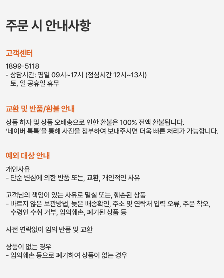 | 교환/반품 비용 (왕복비용) | 8,000원 - 단, 고객 변심의 경우에만 발생 - 도서산간 지역 배송불가 - 부분반품 시, 남은금액이 무료배송 조건을 유지하면 편도 배송비용만 부과 |