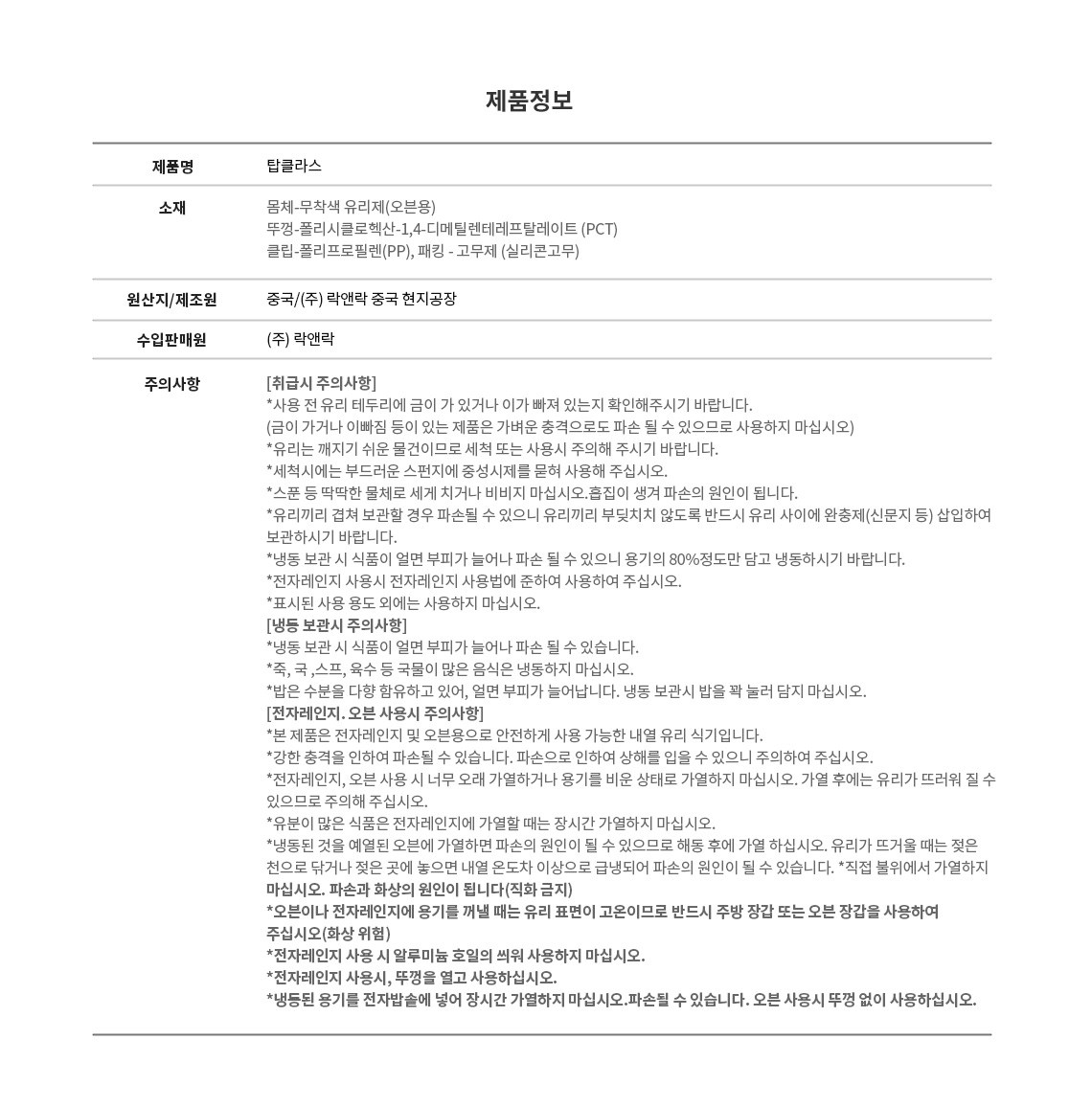 | 품명 및 모델명 | 락앤락 탑클라스 직사각 | 재질 | 컨텐츠 참조 |