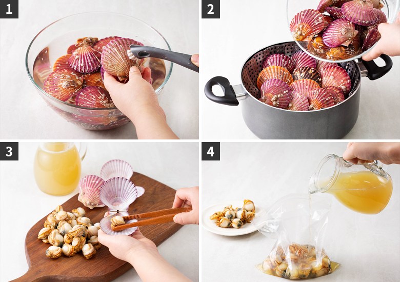 4. 지퍼팩에 가리비살과 모아둔 육수를 같이 넣어주세요.