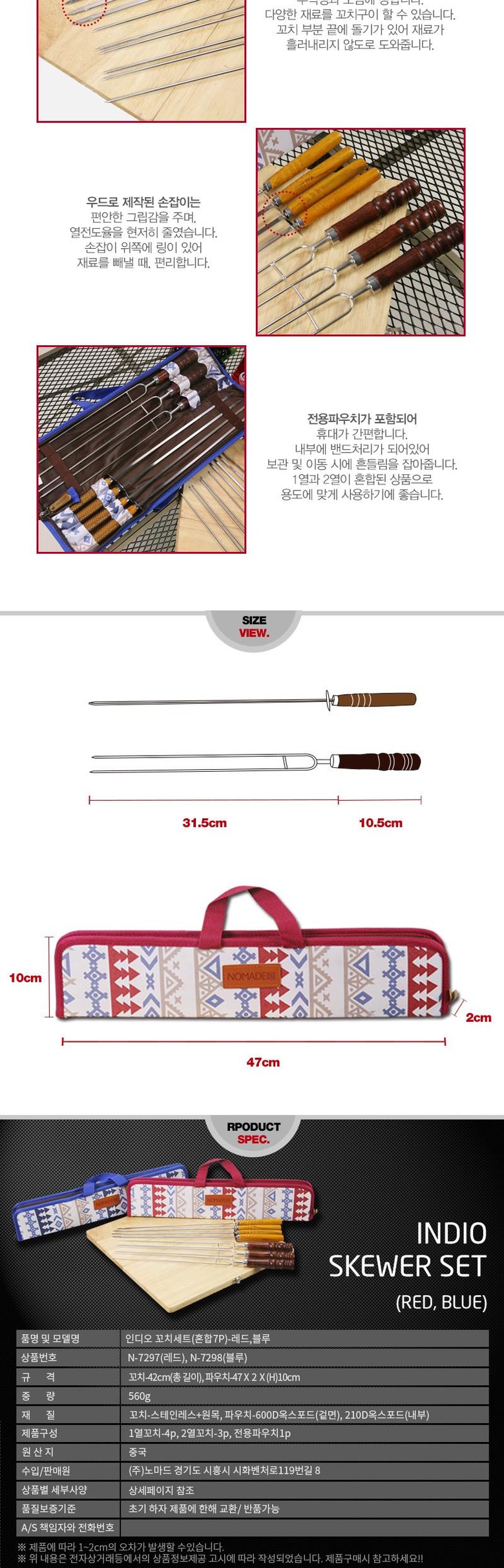 | 품명 및 모델명 | 노마드 인디오 꼬치 1열 4p + 2열 3p 세트_레드 N-7297 노마드 인디오 꼬치 1열 4p + 2열 3p 세트_블루 N-7298 | 인증/허가 사항 | 상품 상세페이지 참조 |