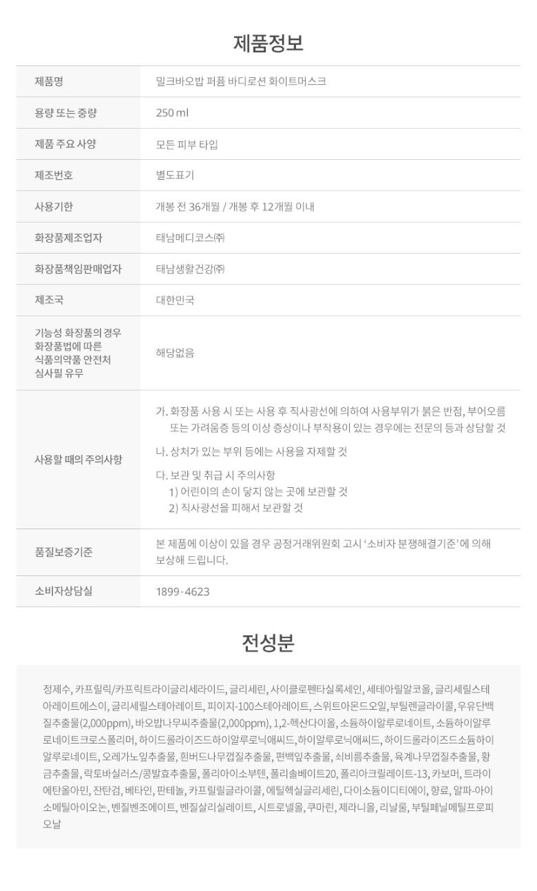 | 화장품제조업자, 화장품책임판매업자 및 맞춤형화장품판매업자 | 태남메디코스(주) / 태남생활건강(주) | 제조국 | 대한민국 |