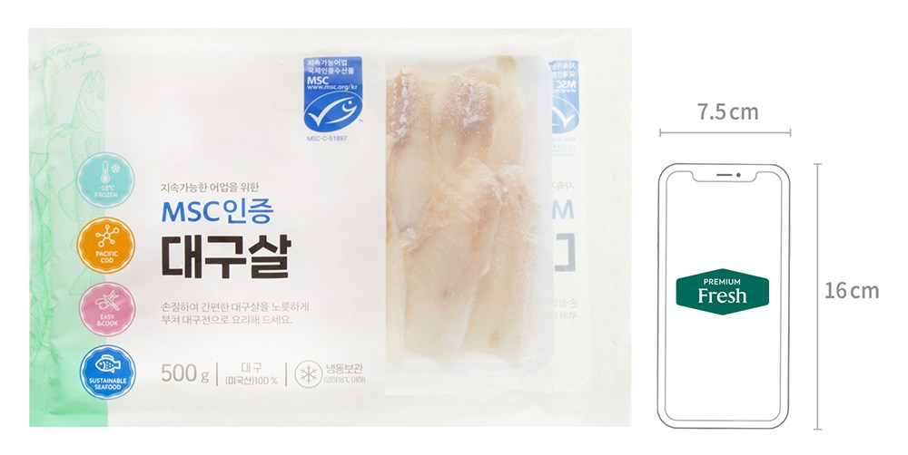 | 품목 또는 명칭 | 대구살 | 포장단위별 내용물의 용량(중량),수량,크기 | 500g x 3개,1개 |