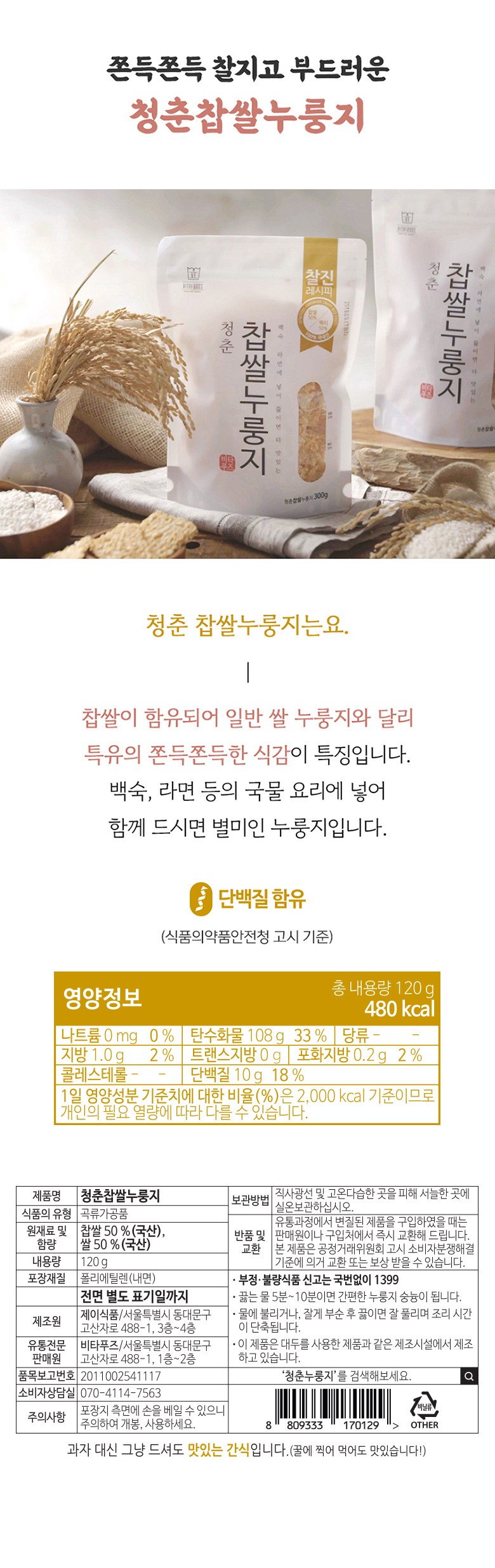 | 제품명 | 청춘찹쌀누룽지 | 식품의 유형 | 곡류가공품 |