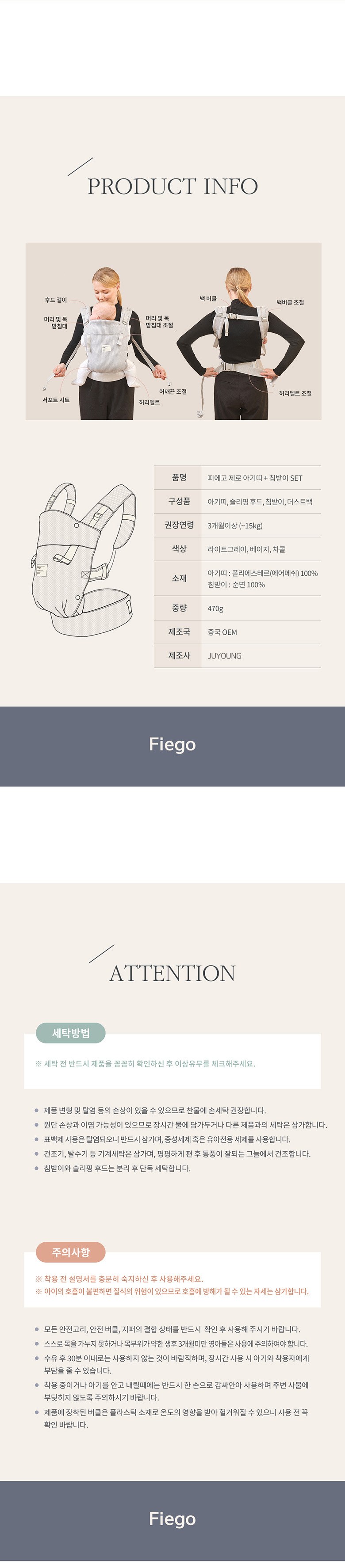 | 품명 및 모델명 | 피에고 제로 베이비캐리어 아기띠 + 침받이 | KC 인증정보 | CB161R082-1001 |