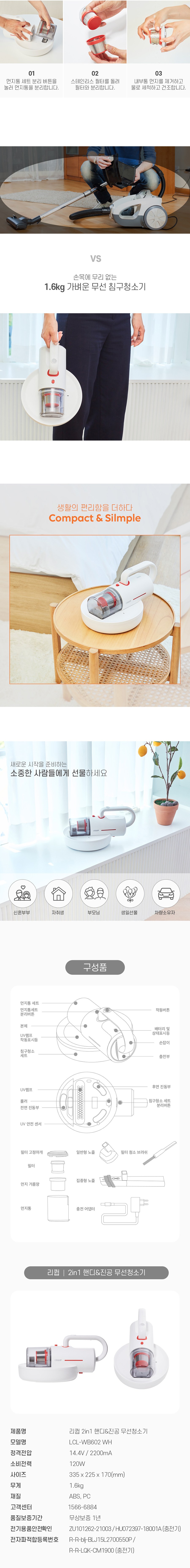 | 품명 및 모델명 | 리큅 2 in 1 핸디 앤 진공 UV 무선 침구청소기 / LCL-WB602 WH | KC 인증정보 | 본품: R-R-LQK-CM1900 / 어댑터: HU072397-18001A, R-R-blj-BLJ15L2700550P / 배터리: ZU101262-21003 |