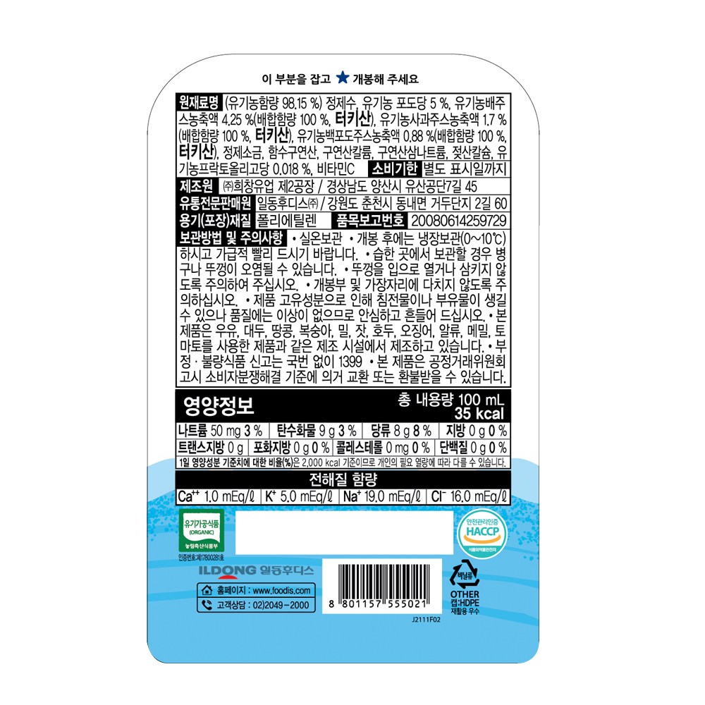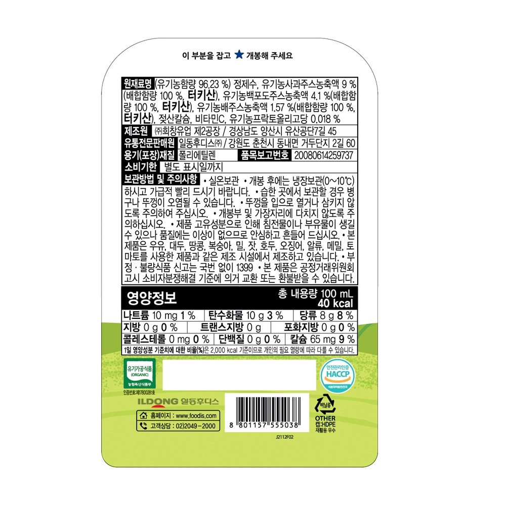 | 제품명 | 아이얌 건강한 아이사랑 순한과일 유기농 | 식품의 유형 | 컨텐츠참조 |