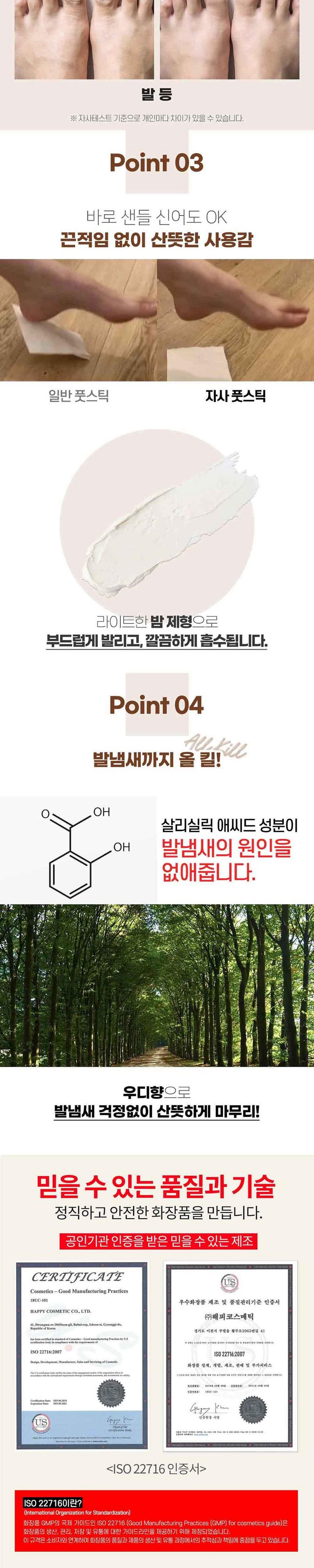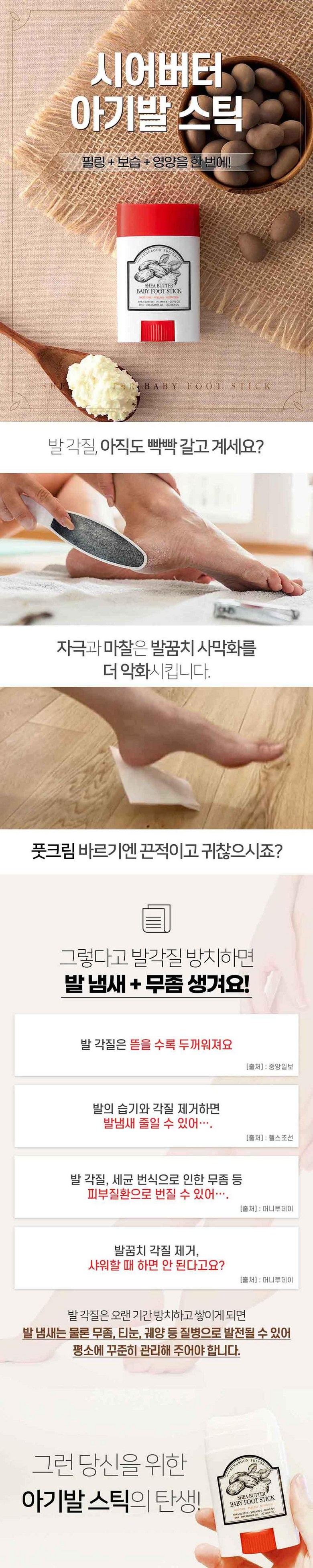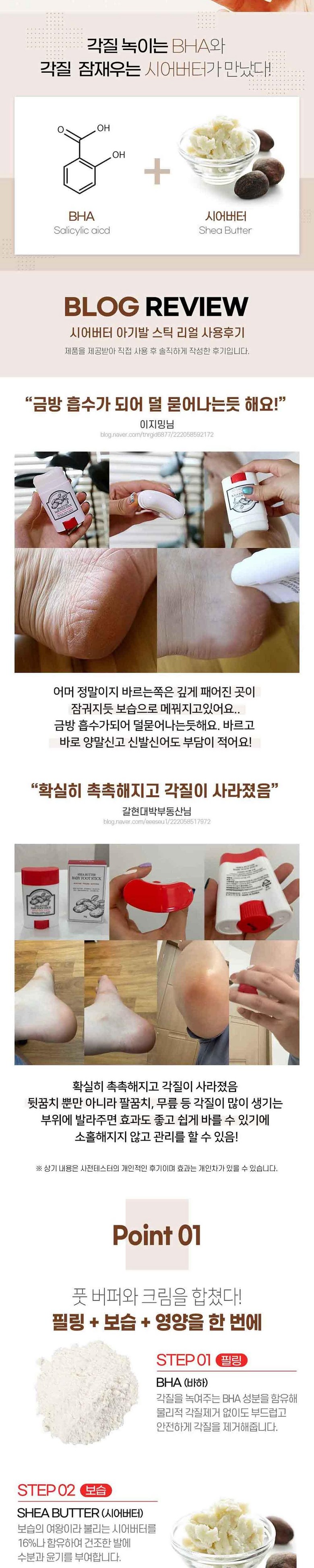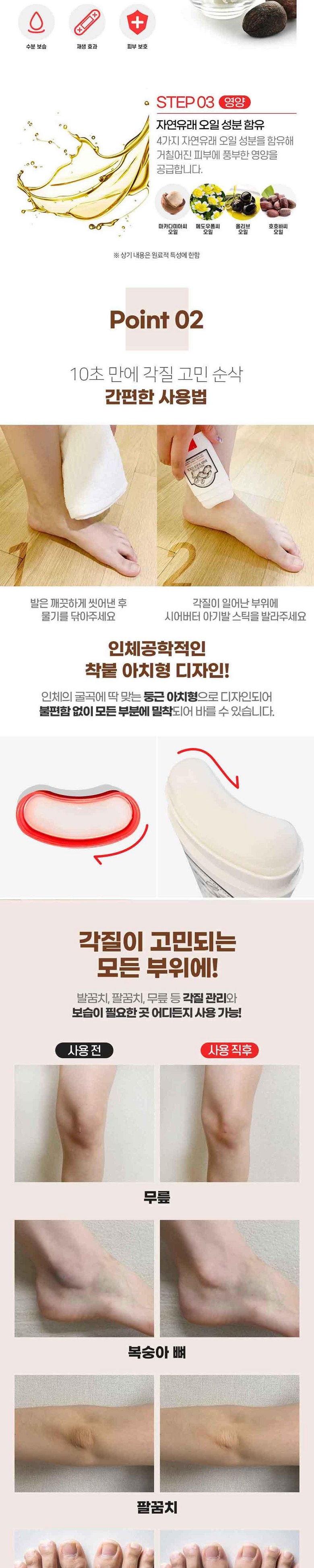 | 사용기한 또는 개봉 후 사용기간 | 개봉 전 36개월 / 개봉 후 12개월 이내 | 사용방법 | 발을 깨끗하게 씻어준 후 건조시킨 다음 스틱을 돌려 내용물이 나오게 한 뒤 각질이나 보습이 필요한 부위에 부드럽게 롤링해줍니다. |