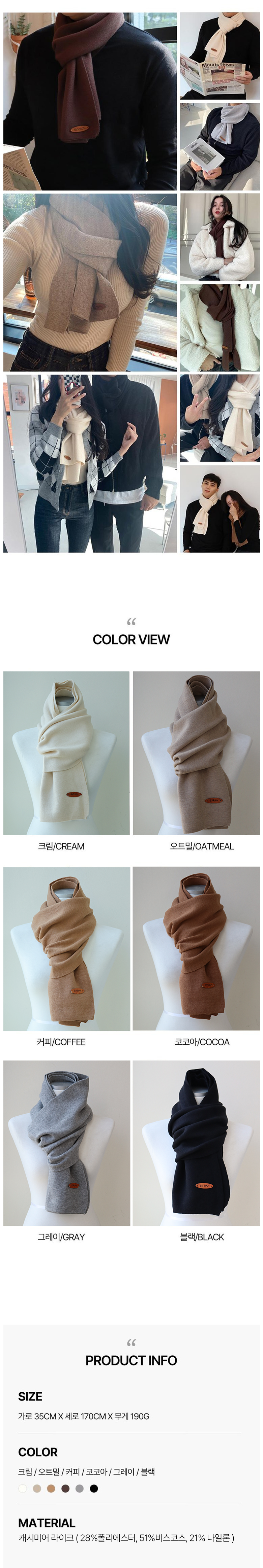 | 종류 | 목도리 | 소재 | 캐시미어 라이크 (28%폴리에스터 51%비스코스 21%나일론) |